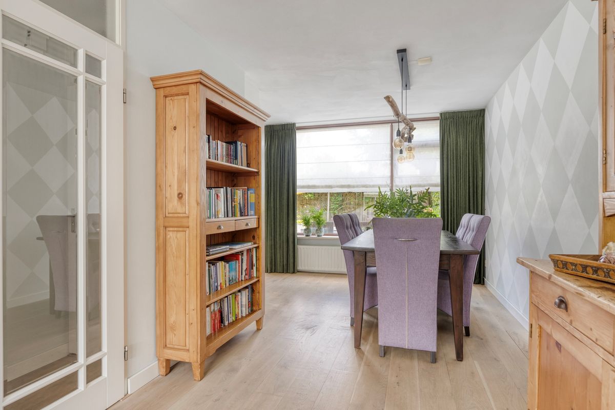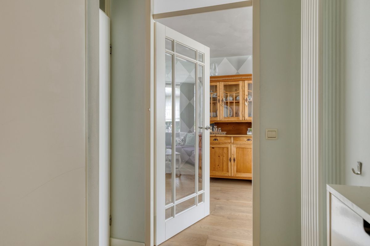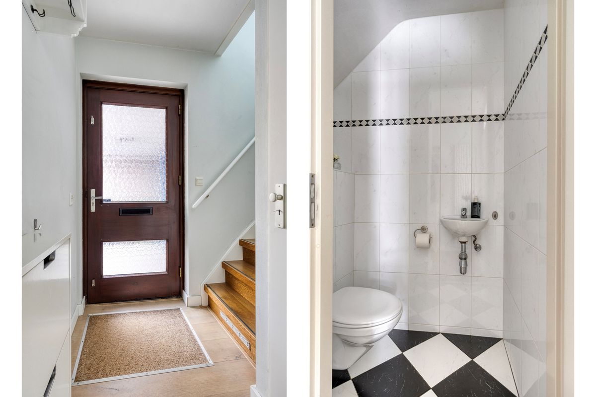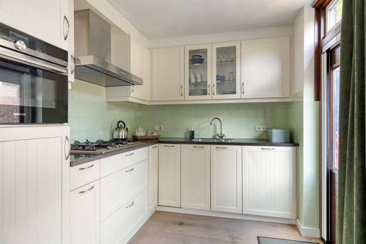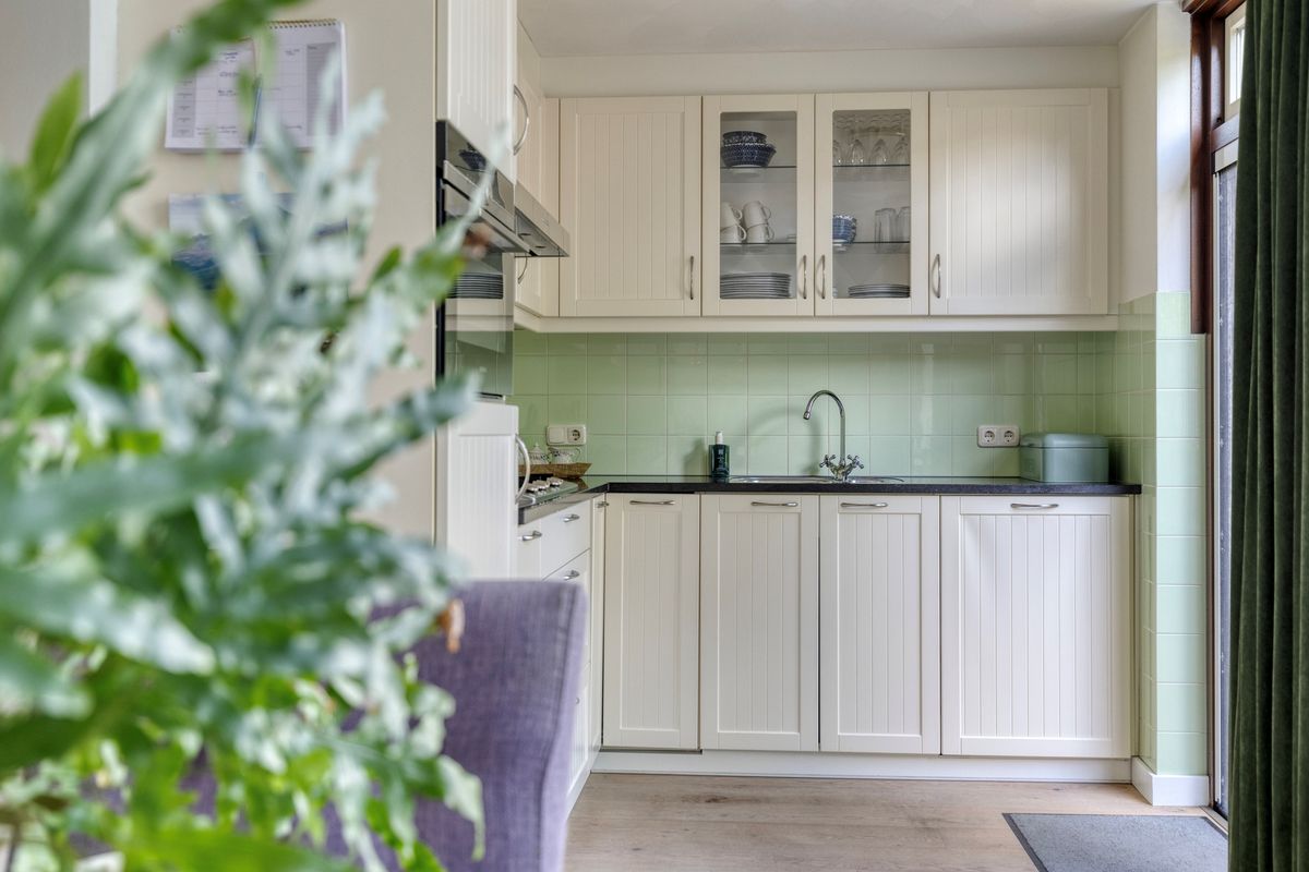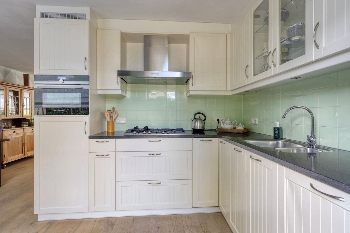 Vanuit de overdekte entree is de hal bereikbaar welke toegang geeft tot de meterkast, het toilet, de trapopgang naar de eerste verdieping en de woonkamer met open keuken. De keuken in L-vorm is v.v. diverse kasten (waarvan 1 met draaicarrousel) en lades, een composiet werkblad met spoelbak en kraan, een 5-pits gaskookplaat met afzuigkap, combimagnetron (Siemens), koelkast en een vaatwasser (Miele). Vanuit de keuken is er toegang tot de achtertuin. De vloer van de begane grond is v.v. een houten vloer (multiplank). De wanden en plafonds zijn afgewerkt met stucwerk. De kozijnen zijn van hout met dubbel glas. Het toilet is geheel betegeld en v.v. een hangend toilet en fonteintje.