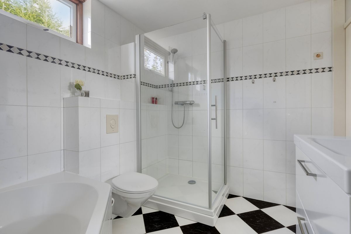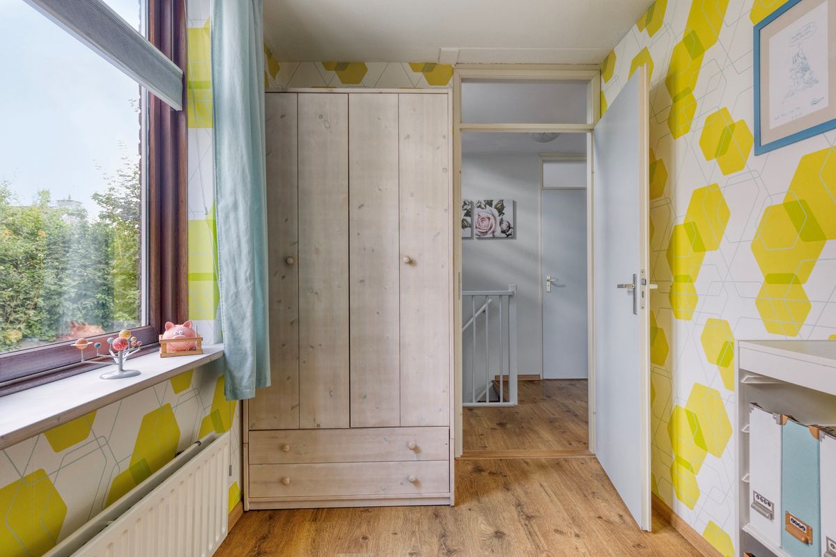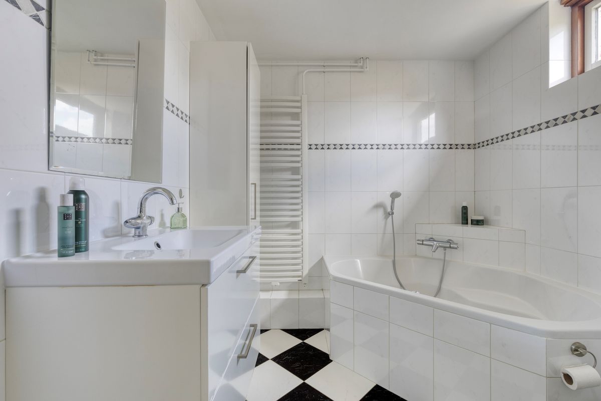 Vanuit de overloop zijn 3 slaapkamers, de badkamer en de trapopgang naar de tweede verdieping bereikbaar. De badkamer is geheel betegeld en v.v. een hangend toilet, wastafel met meubel en losse kast, een douchecabine, hoekbad en een designradiator. De vloer van de overloop en de slaapkamers is v.v. laminaat. De wanden zijn afgewerkt met behang. De plafonds zijn v.v. spuitwerk. De kozijnen zijn van hout met dubbel glas.