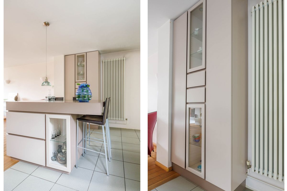 The spacious kitchen is equipped with various appliances including a 4-burner gas hob, an oven, an extractor hood, and a dishwasher. It also features a custom-made kitchen island with a raised seating area and additional cupboard space. A built-in high cupboard wall with display cabinets in the same style and color completes the kitchen. A matching cabinet wall is also found in the seating area, featuring another built-in display cabinet for a cohesive design.