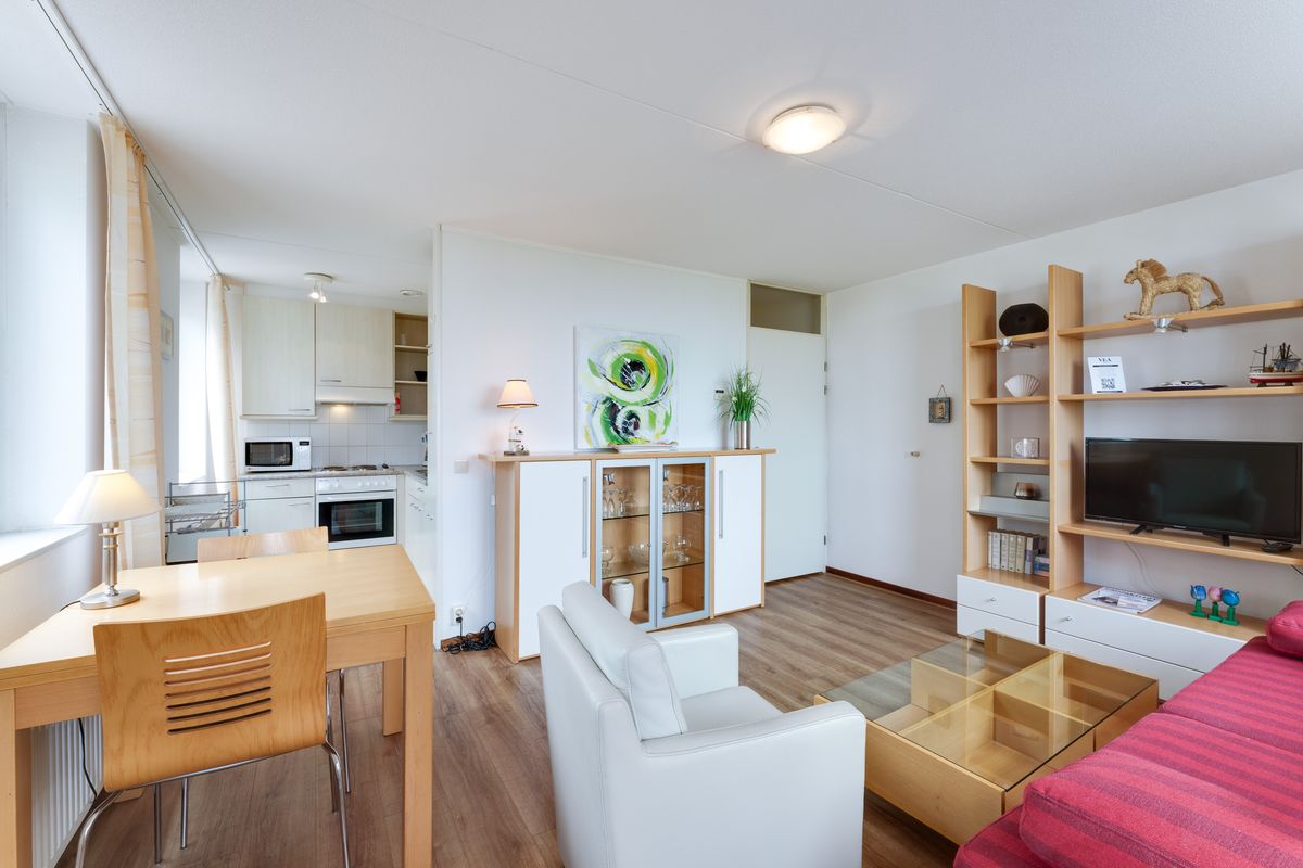 De hal van het appartement geeft toegang tot alle vertrekken. Aan de voorzijde ligt de woonkamer met open keuken. Grote raampartijen zorgen voor een overvloed aan licht en versterken het gevoel van ruimte. Het zeezicht trekt meteen de aandacht: zowel vanuit de woonkamer als vanaf het balkon geniet je van voorbijvarende schepen, de kleuren van de lucht en de rust van de duinen. Het balkon fungeert als verlengstuk van de woonkamer, perfect voor een ontbijt in de ochtendzon of een borrel bij zonsondergang.