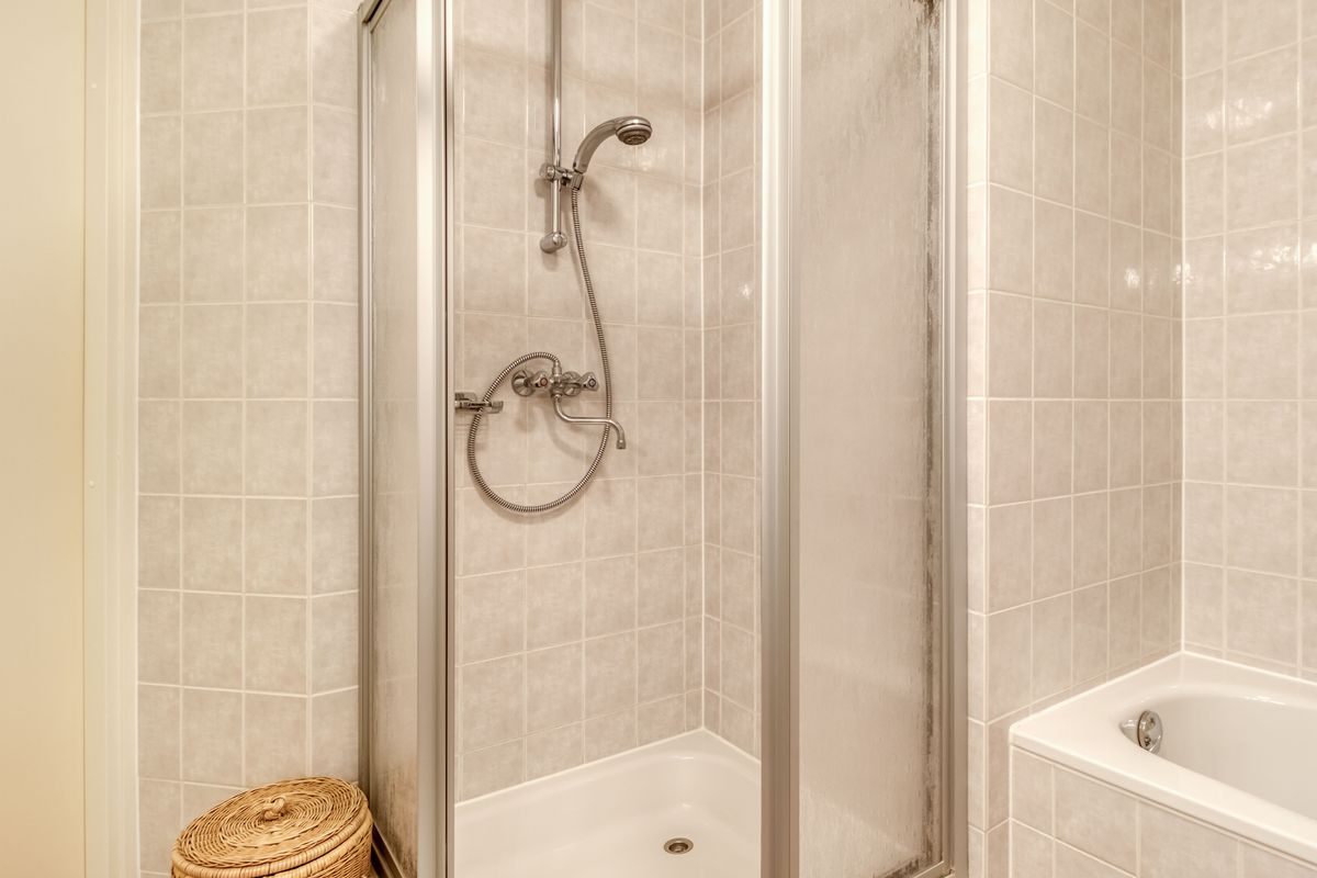 De ruime badkamer is ingericht met een ligbad, aparte douche, een tweede toilet en dubbele wastafel — een praktisch en comfortabel geheel.