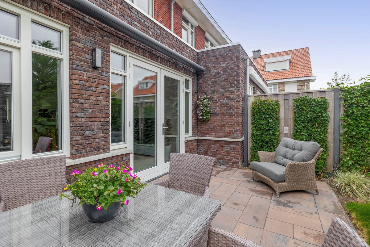 Bij binnenkomst in de woonkamer valt de hoeveelheid ruimte en licht direct op. De ruime woonkamer ligt aan de achterzijde van de woning en is voorzien van een uitbouw van 1,2 meter. De dubbele openslaande deuren leiden naar de tuin op het zuiden met een ruim terras. De trapkast is voorzien van een greeploze deur in de stijl van de ambachtelijke maatwerk keuken.