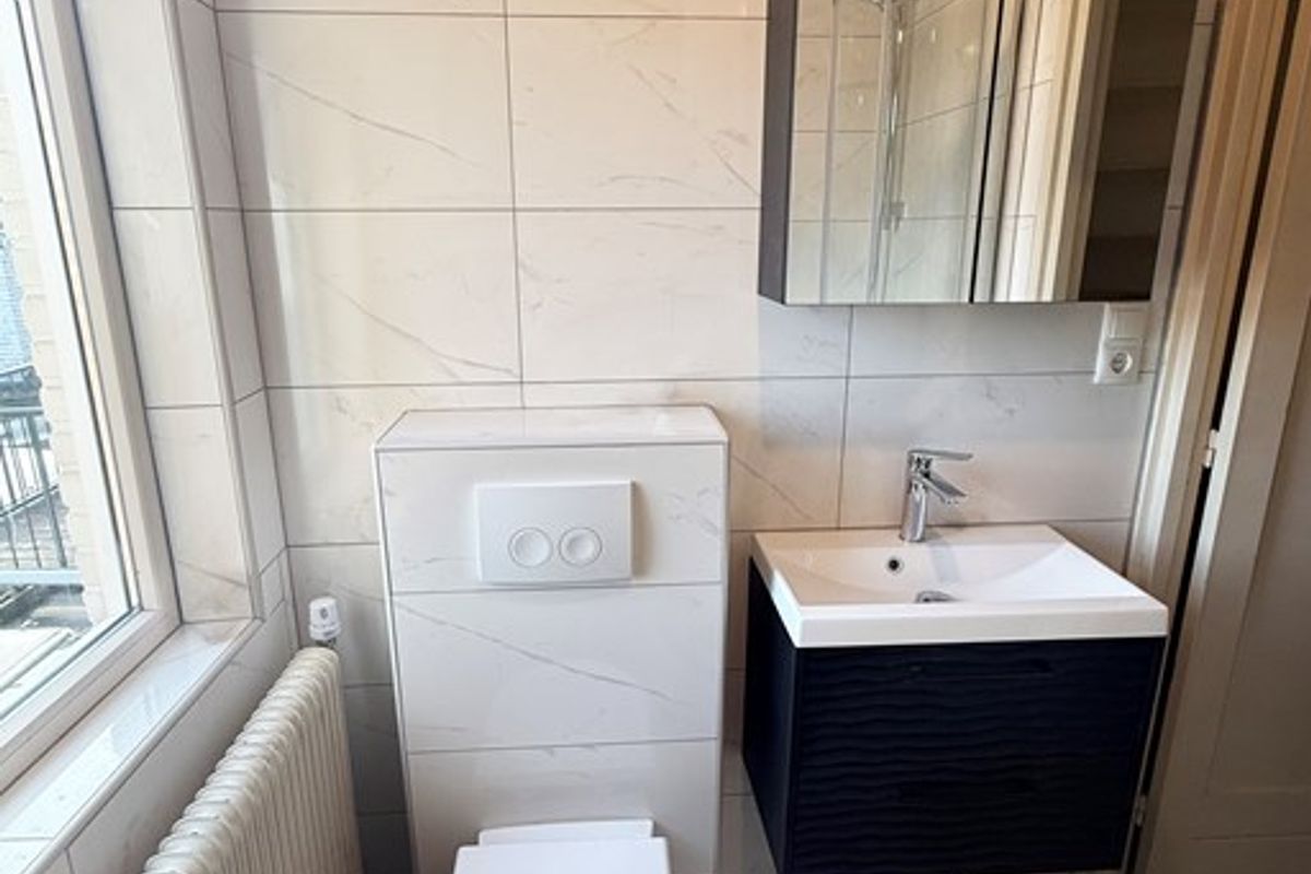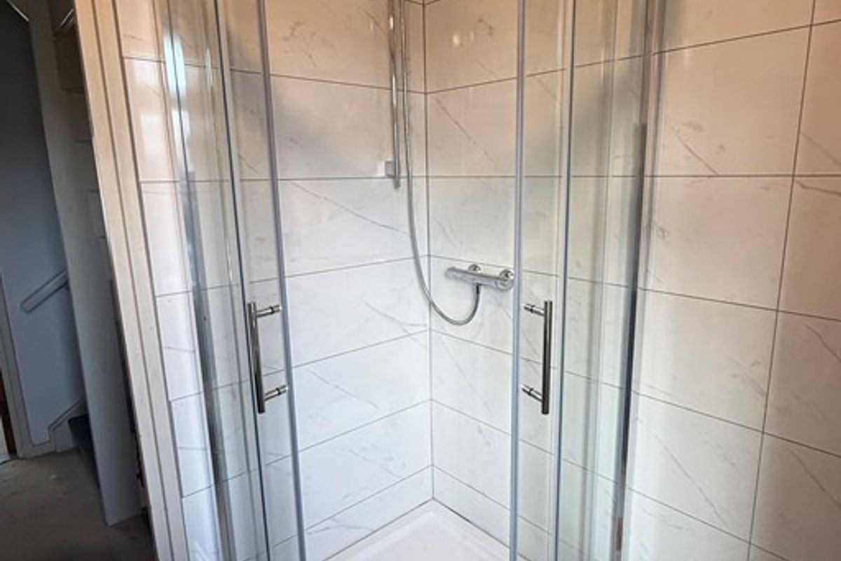 Overloop met toegang tot de in 2025 vernieuwde badkamer (3 m²), voorzien van een douche, toilet en wastafel. De woonkamer (43 m²) is speels ingedeeld met twee niveaus; het hogere niveau geeft toegang tot de keuken (8 m²) en de overloop. De moderne keuken is nieuw en voorzien van een inductiekookplaat, afzuigkap, koelkast en vaatwasser.