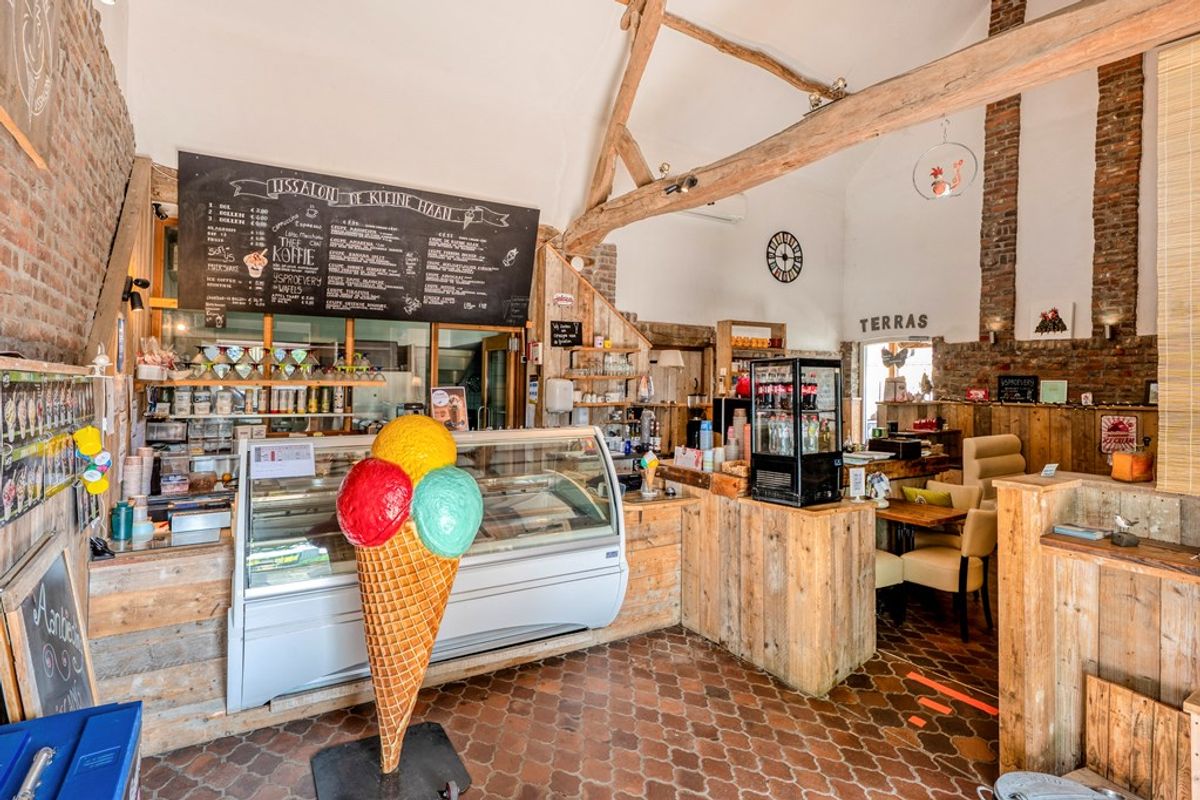Aan de voorzijde ligt een mooi afgewerkte ruimte met authentieke kenmerken en een mooie tegelvloer, momenteel in gebruik als ijssalon. De ijssalon heeft een eigen entree via de fraaie toegangspoort en een extra ingang via de rechterzijde. Deze laatste komt uit op het zonnige terras, dat in verbinding staat met, maar afgescheiden is van, de privé-tuin. Contract van de ijssalon is beëindigd en de ruimte wordt kaal opgeleverd , waardoor deze door de toekomstige eigenaar naar eigen inzicht ingericht kan worden . Het betreft een multifunctionele ruimte die zowel zakelijk als privé gebruikt kan worden.