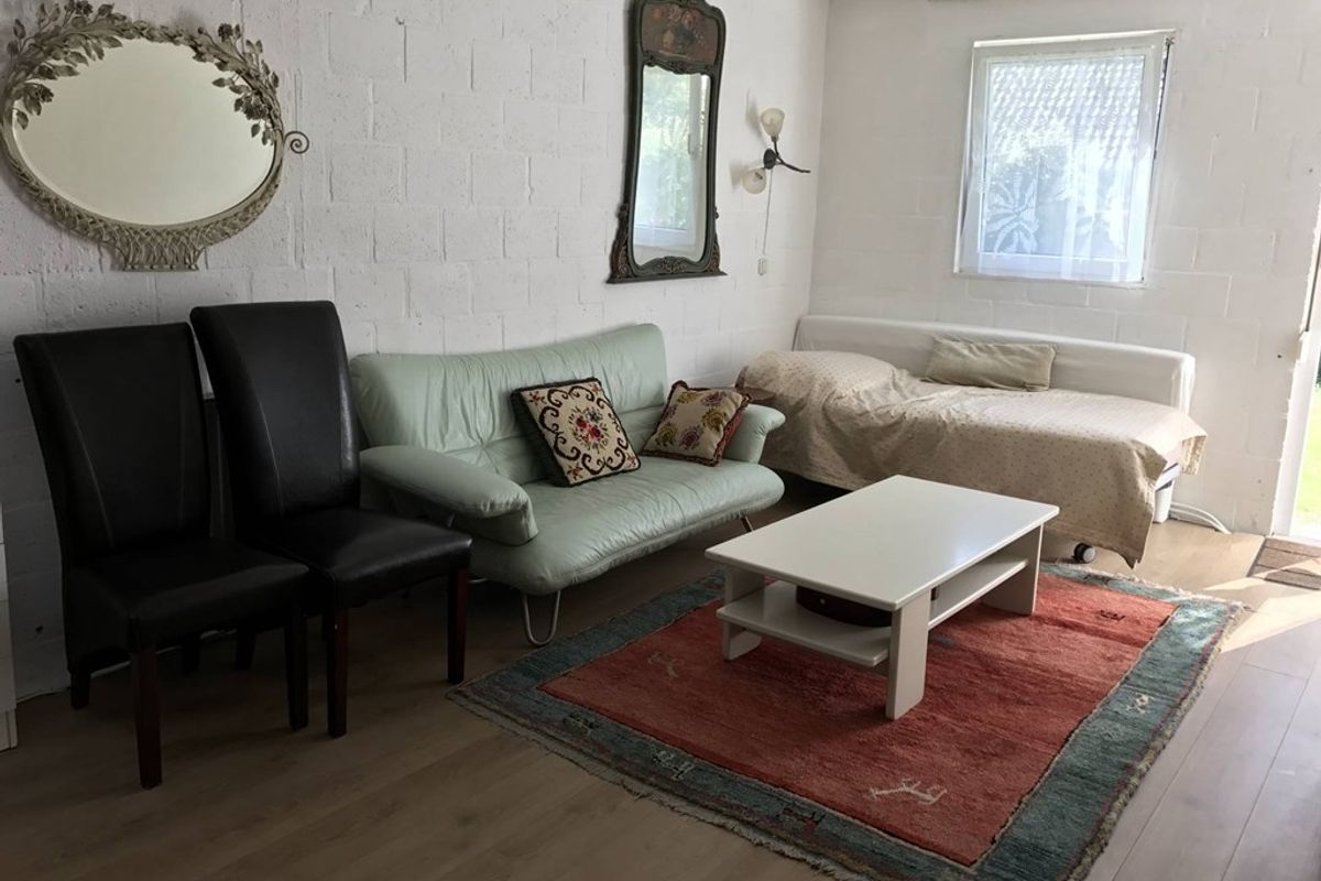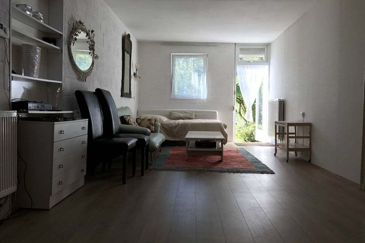 The 30 m² studio is situated on the ground floor of a detached house and is fully furnished. It features wooden flooring, a bed, a sofa, a coffee table, two chairs and various cupboards.