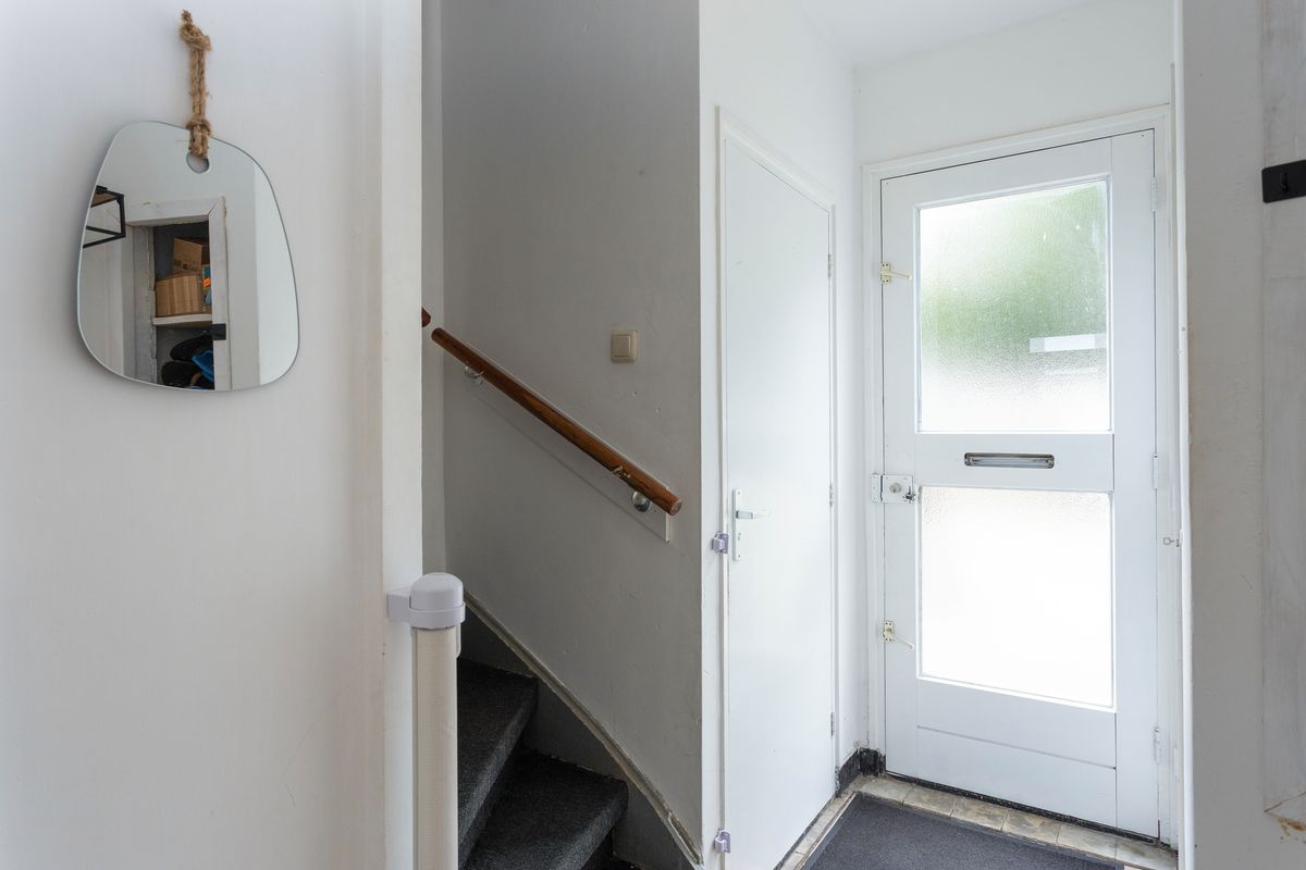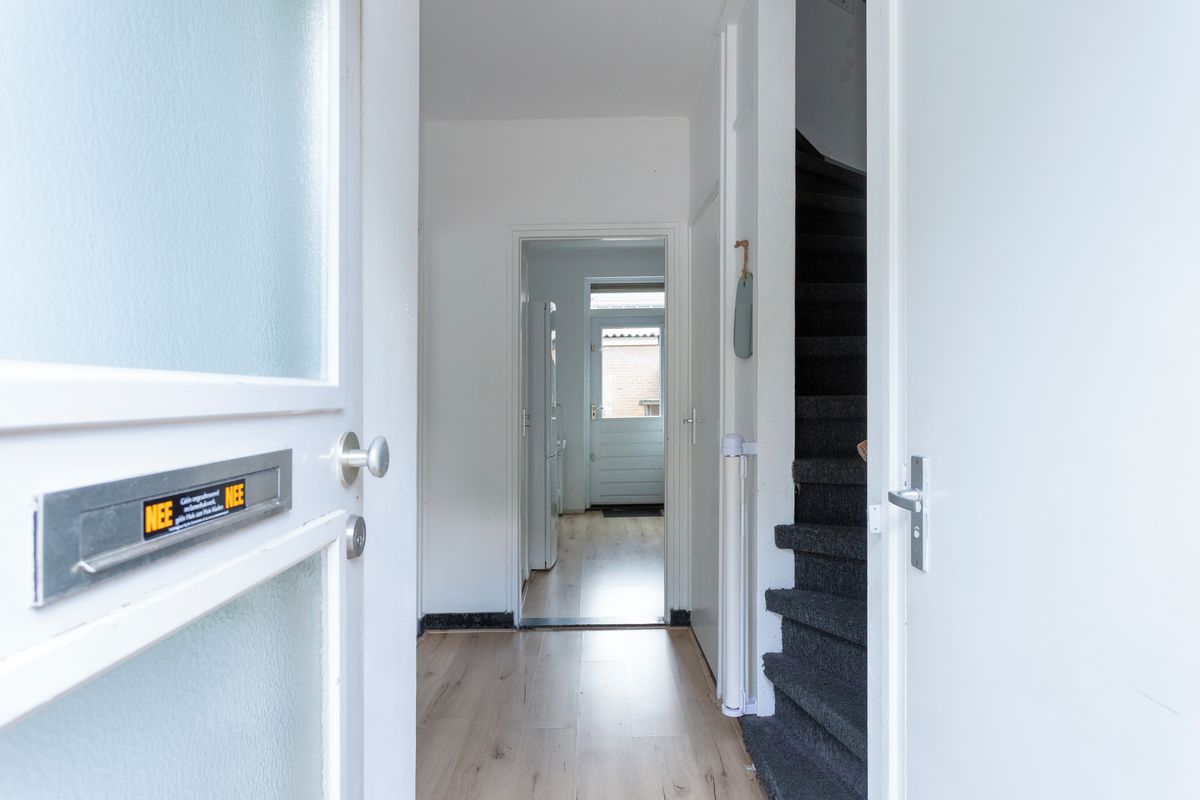 De entree biedt toegang tot de hal van de woning. In de hal vindt u de meterkast (7 groepen, kookgroep en 2 aardlekschakelaars), een kelderkast, de trapopgang naar de eerste verdieping en de toiletruimte. Via de hal komt u in de woonkamer en de keuken. In de doorzonwoonkamer is voldoende ruimte voor het plaatsen van zowel een zit- als een eethoek. Door de grote ramen in de woonkamer is er veel lichtinval. De keuken is ingericht met een modern keukenmeubel in een witte kleur met een rvs werkblad, v.v. een inductiekookplaat, afzuigkap, magnetron en vaatwasser. Er is voldoende ruimte voor plaatsen koelkast en vriezer, ook is de keuken v.v. een vaste inbouwkast. Alle plafonds en wanden op de begane grond zijn voorzien van stucwerk, op de vloeren ligt laminaat (2023 nieuw) met een houtprint.