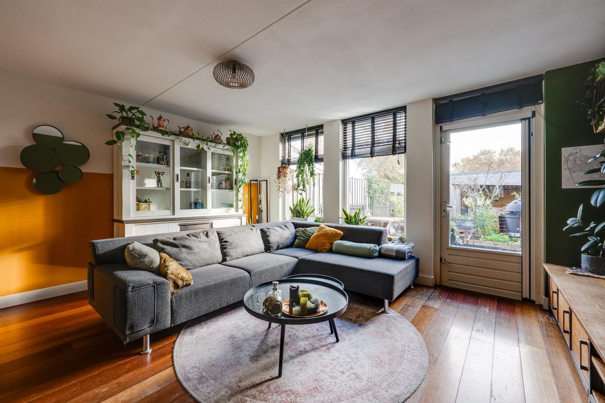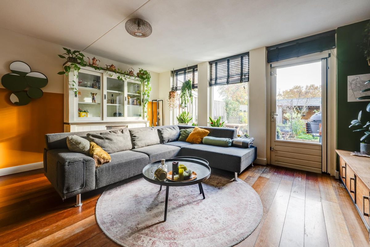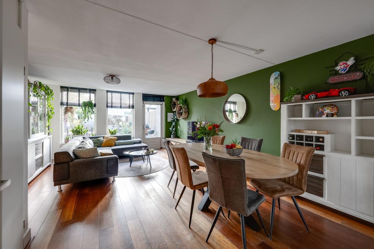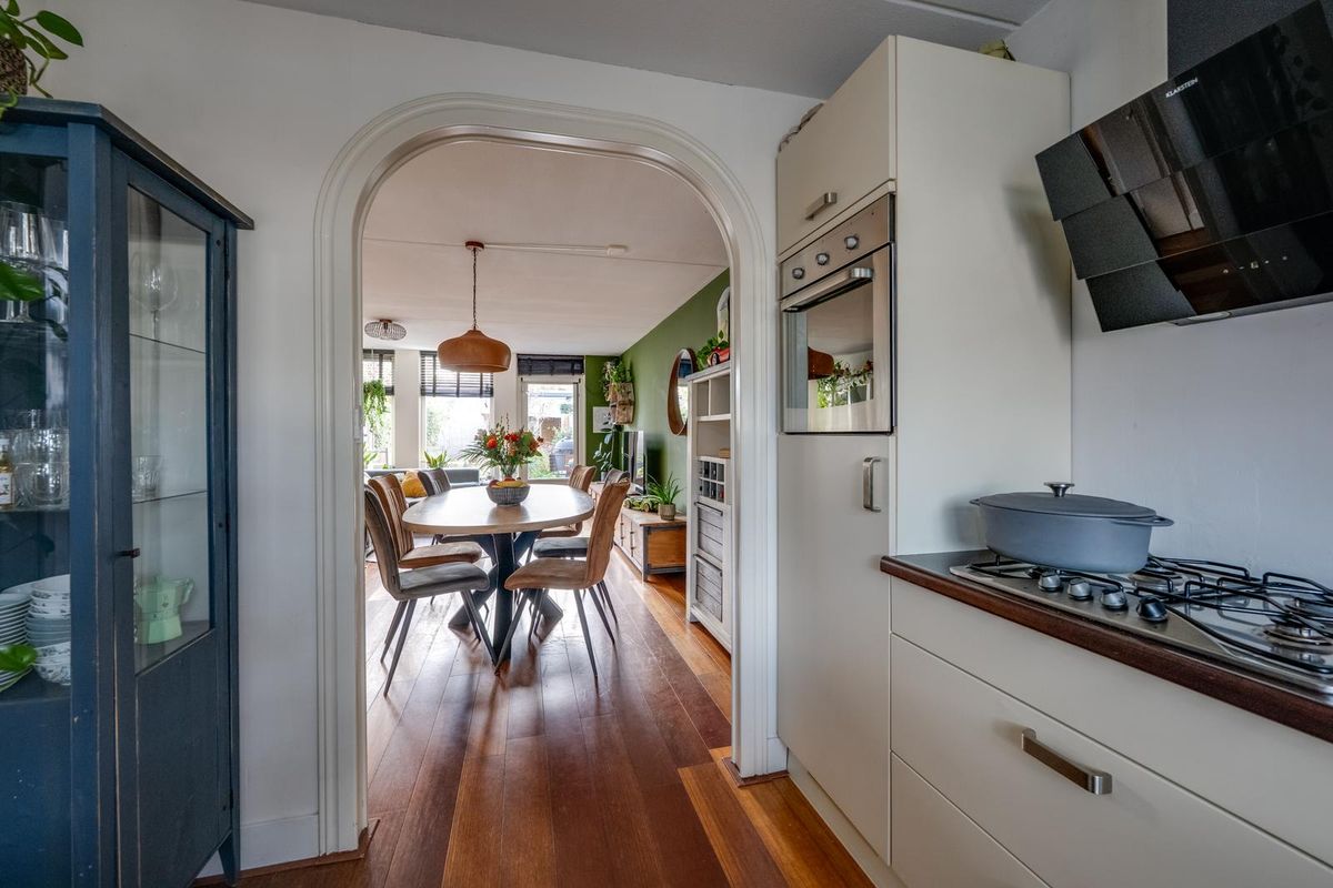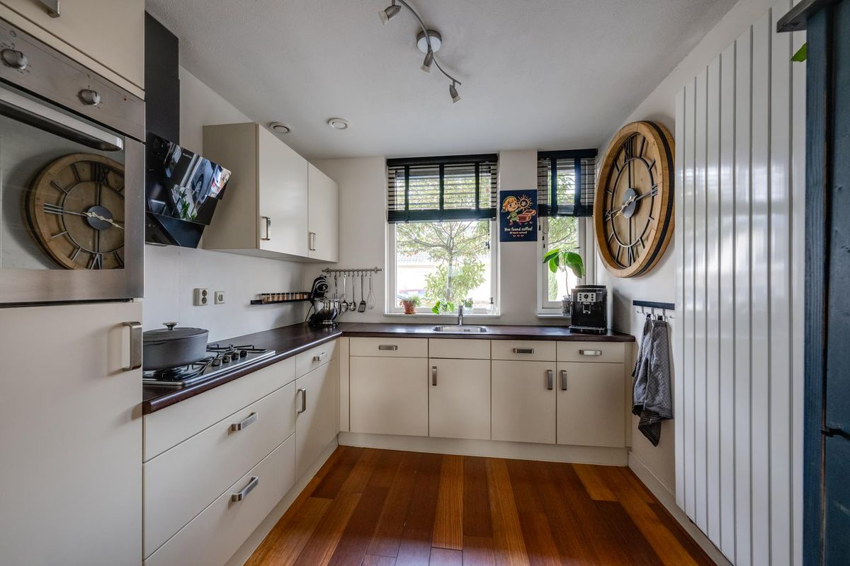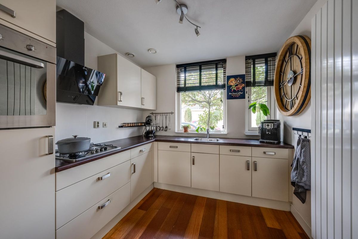 Aan de voorzijde ligt de keuken in hoekopstelling. Een fijne plek om te koken: je hebt hier namelijk zicht op de straat, waardoor er altijd iets te zien is terwijl je staat te kokkerellen. De keuken beschikt over diverse inbouwapparatuur en praktische werk- en kastruimte.