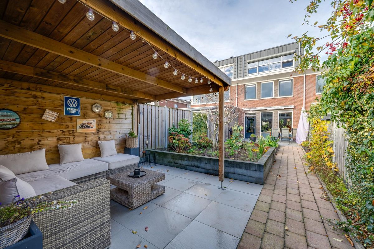 De voortuin is onderhoudsvriendelijk aangelegd. De achtertuin ligt op het zuid-oosten, waardoor je hier heerlijk veel zonuren hebt. De tuin biedt veel privacy en is ingericht met een gezellige overkapping, berging, moestuin, borders en een fijn terras. Via de achterom kun je gemakkelijk met de fiets of afvalcontainers naar buiten.
