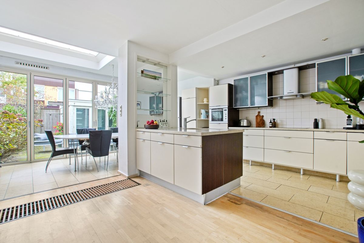 De open keuken met kookeiland sluit aan op de lichte serre-uitbouw met glazen dak en vloerverwarming, waar u het hele jaar door geniet van veel licht en een ruimtelijk gevoel.