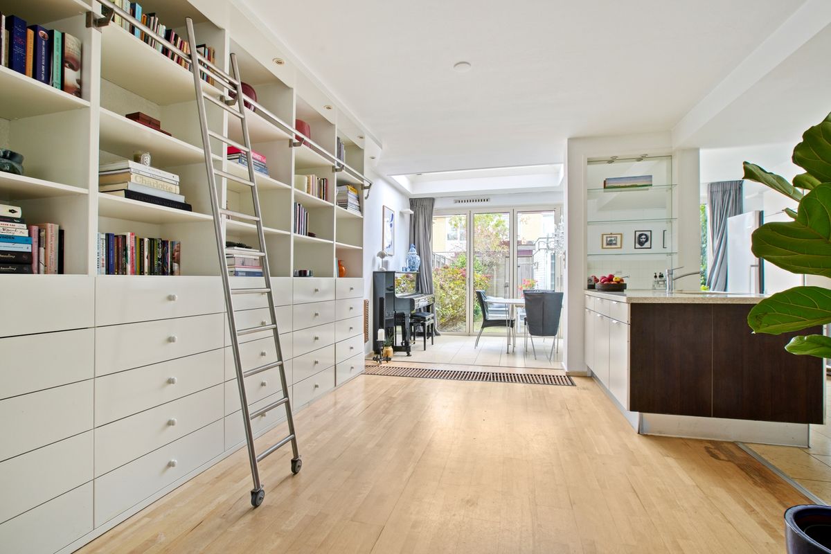 The conservatory flows naturally into the southeast-facing back garden, which offers access to a shared, enclosed rear entrance and a spacious storage shed — perfect for bicycles and extra storage.