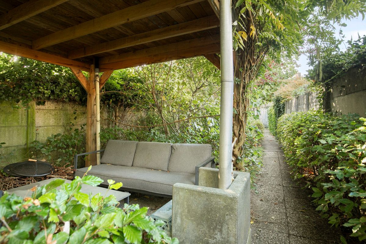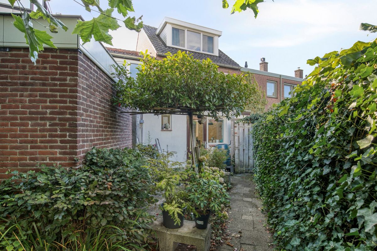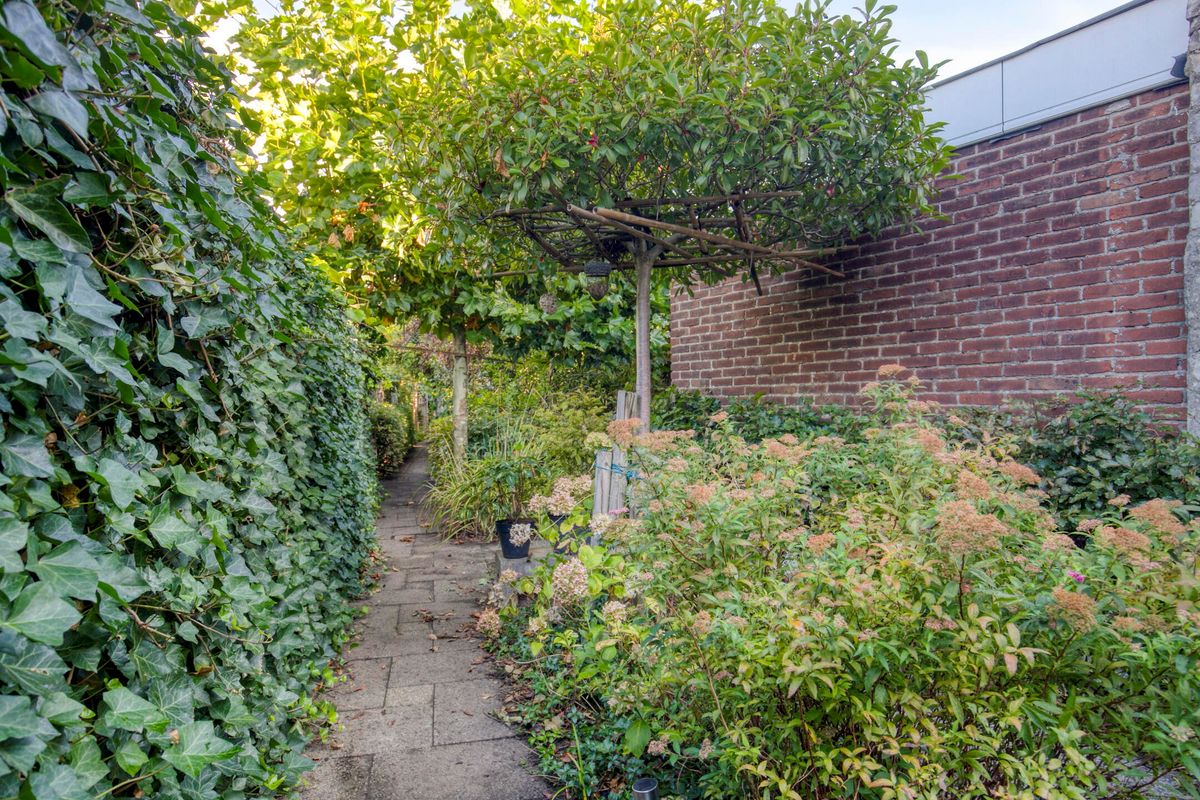• De zeer diepe achtertuin is groen van opzet met veel planten, struiken, (lei)bomen en hagen. Hier zou je niet zeggen dat je midden in het centrum woont, met zoveel tuin en groen. Halverwege in de tuin nog een overkapping en een stenen berging (halfsteens uitgevoerd).