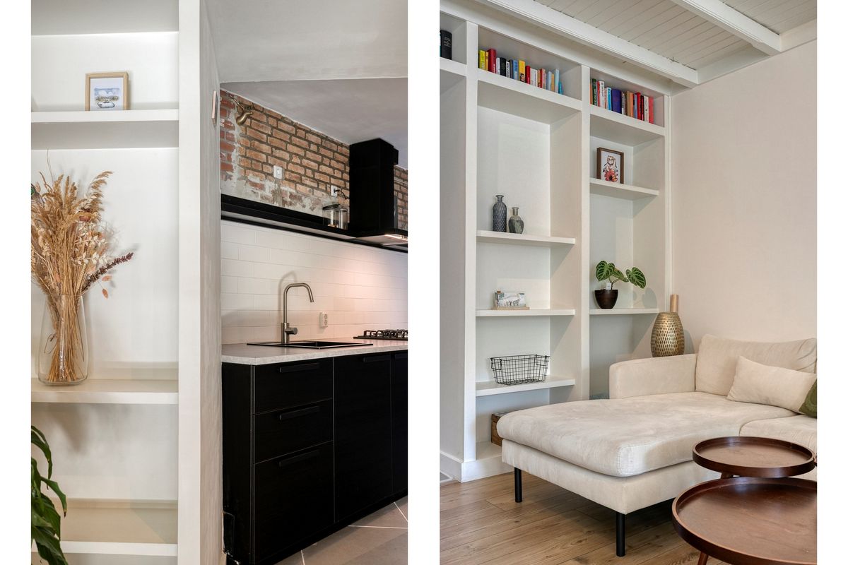 • Woonkamer met open keuken: via een glazendeur in de hal toegang tot de heldere woonkamer met open haard/ schouw en een fraaie kastenwand bij doorgang naar de keuken. In de woonkamer een laminaatvloer, muren en plafond afgewerkt met stucwerk en nog een trapkast.