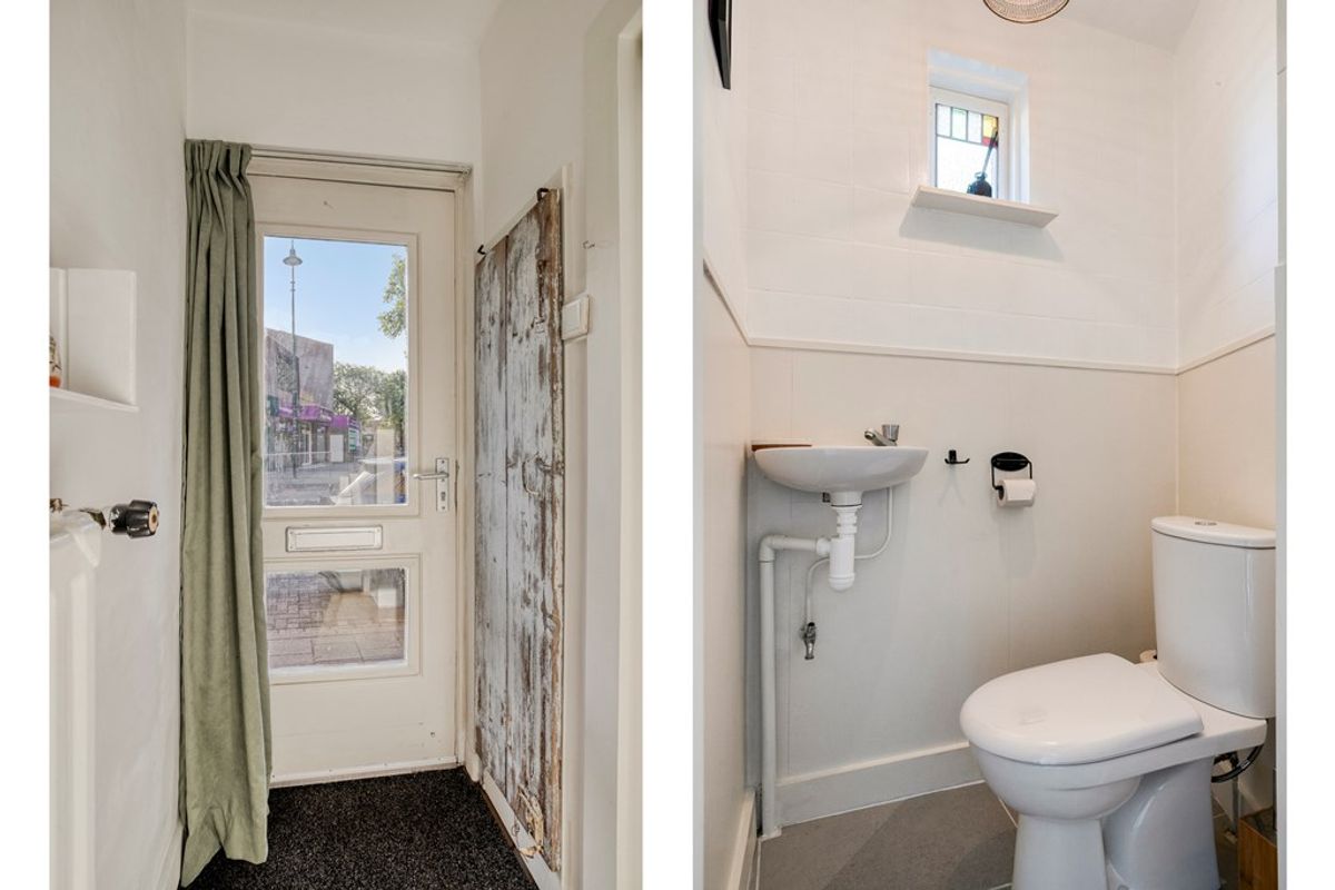 • Tussenportaal: ruimte met toegang tot de toiletruimte en de cv-installatie Intergas combi HR cv november 2016 (onderhoud nov. 2024) en een kleine voorraadkast. In de toiletruimte een staand closet met fonteintje. Ventilatie via uitzetraampje. Dit is het enige raam met enkel glas.