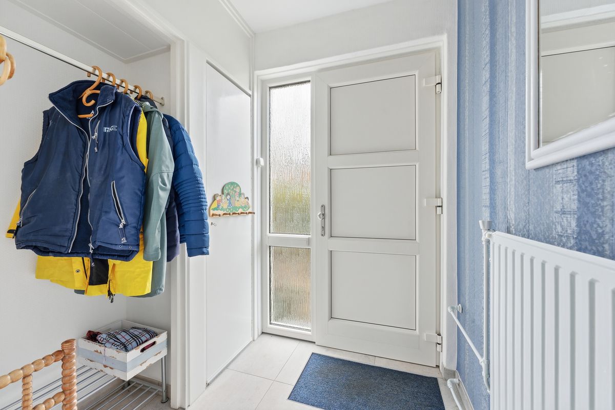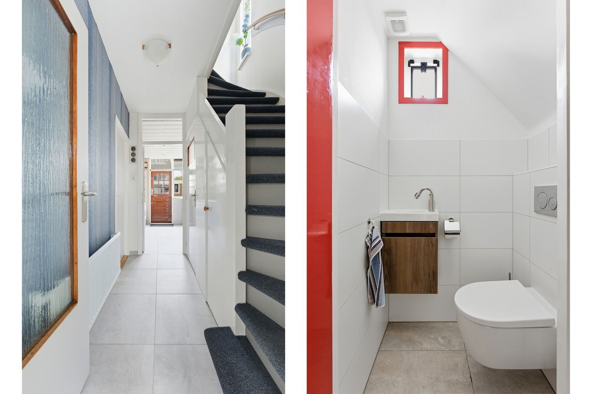 Entree: Je komt binnen in een ruim voorportaal met voldoende ruimte voor je garderobe, waarna je doorloopt naar de hal. Hier bevinden zich de trapkast, toiletruimte, de trapopgang naar de eerste verdieping en de toegang tot zowel de woonkamer als de keuken. De ruimte is afgewerkt met plavuizenvloer, behangwanden en een gestuukt plafond.
