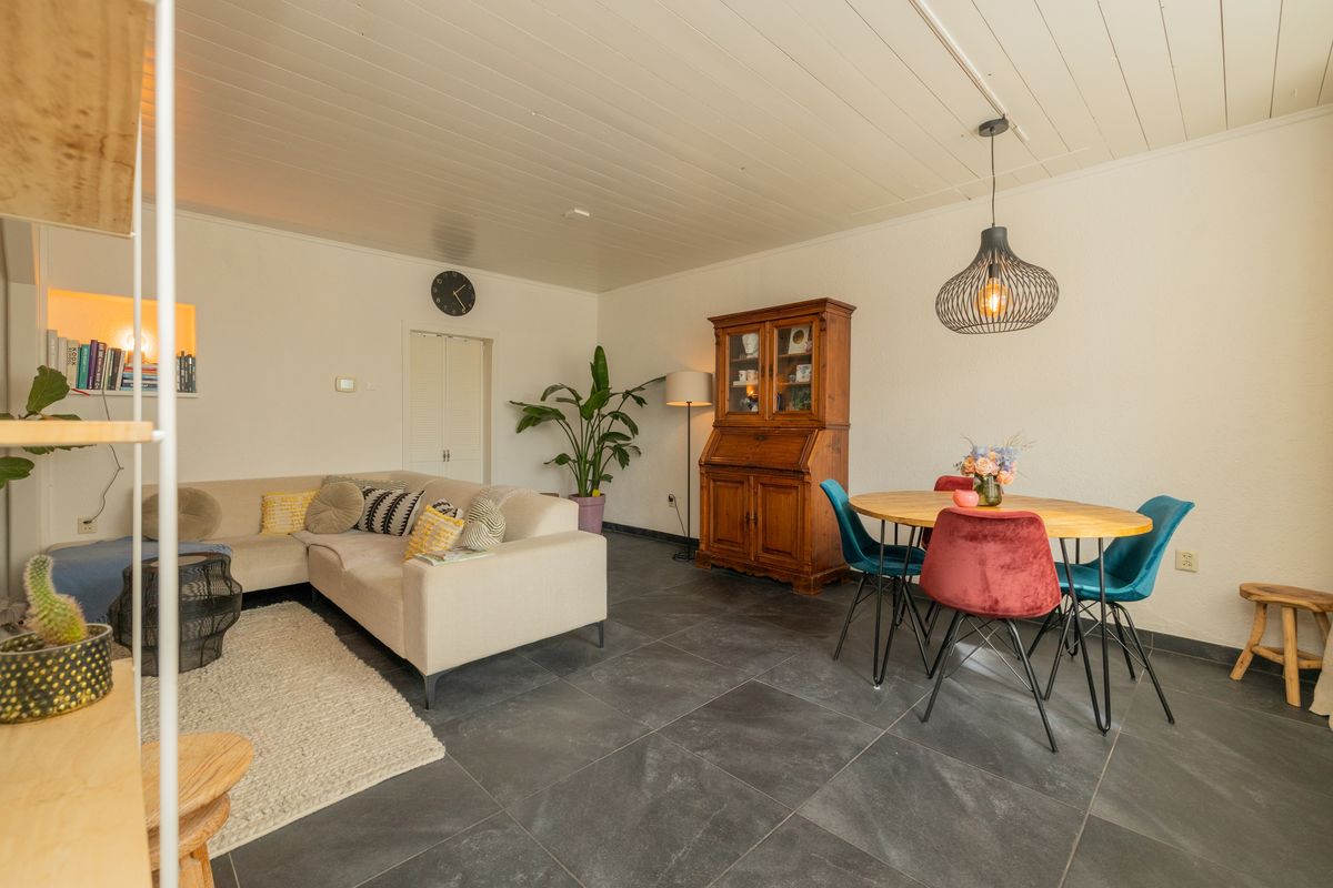 de knusse woonkamer. Door de grote ramen aan de voorzijde komt er veel licht binnen. Bij