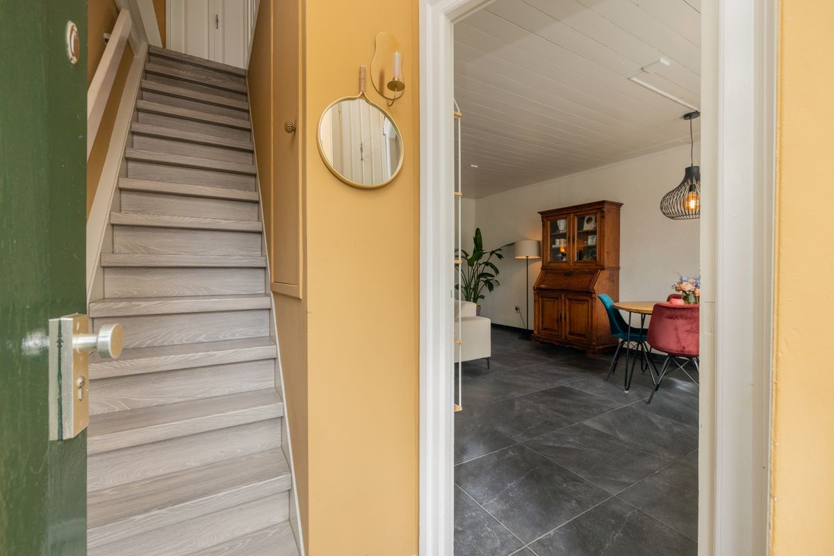 balken en een houten plafond, antraciet tegels op de vloer, en onder de vaste trap nog een handige