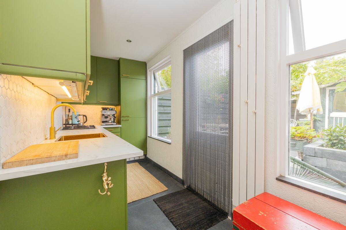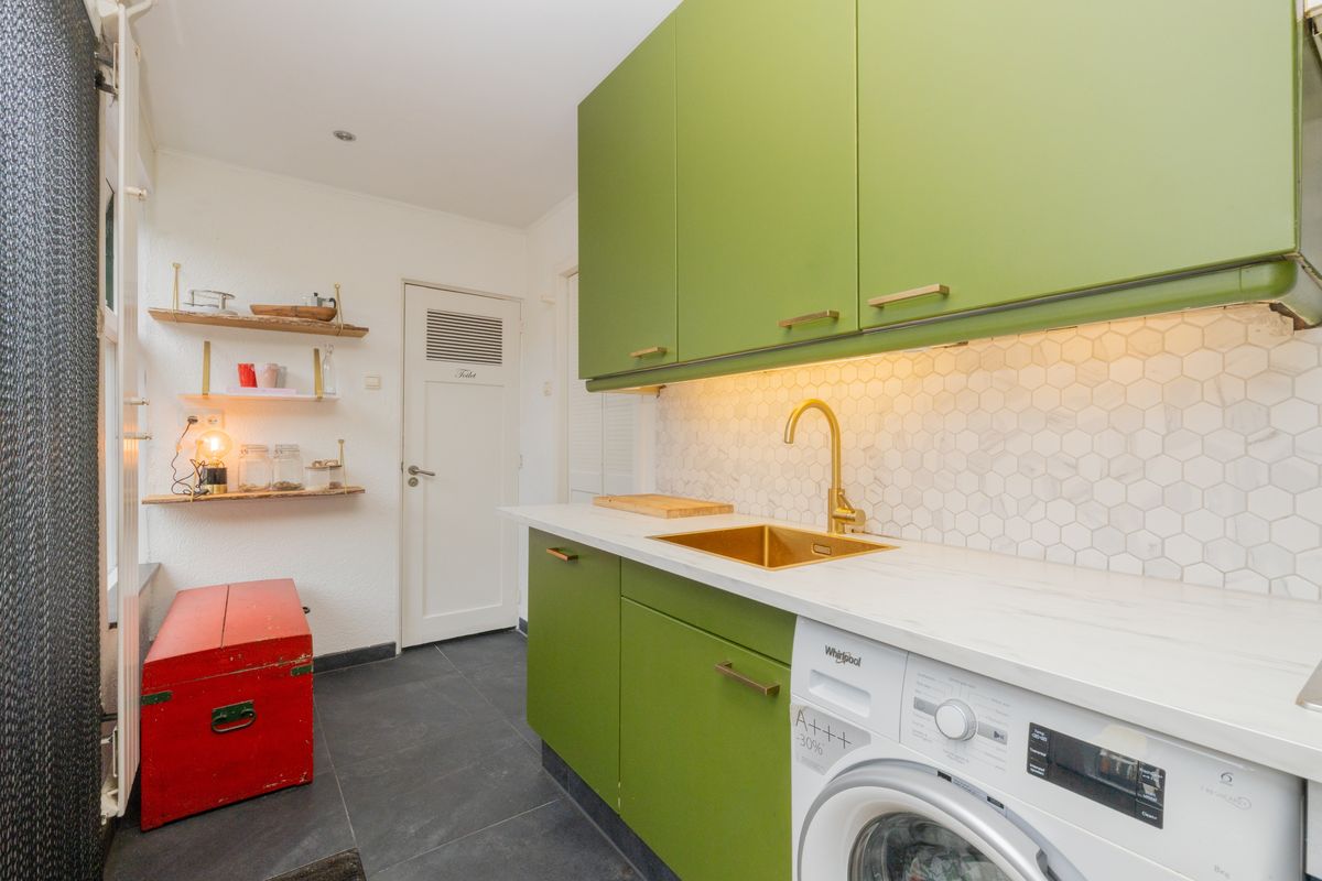 de wasmachine heeft hier een mooie plek en daar is ook de buitendeur naar de achtertuin. De