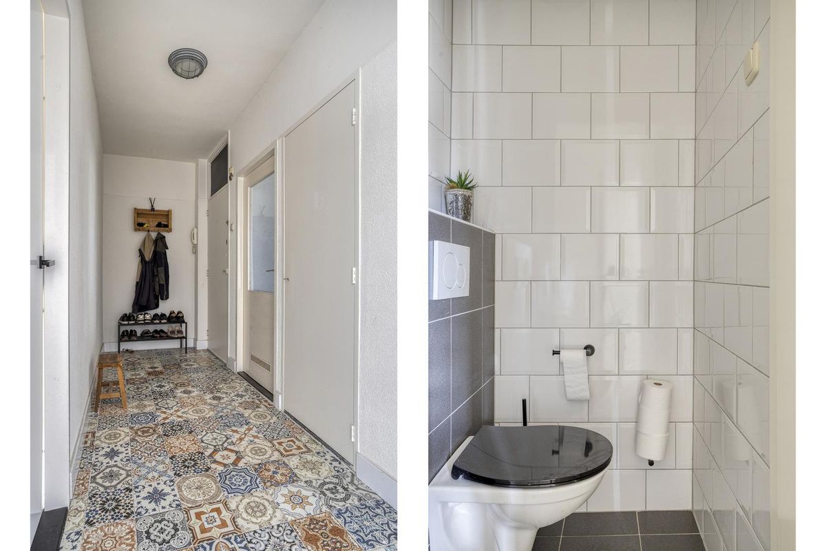 Het appartement ligt op de derde verdieping. Je komt binnen in de hal, waar de Portugese tegeltjes direct een warme, karaktervolle sfeer creëren. De hal biedt toegang tot de gesloten keuken, het toilet, één van de slaapkamers en de woonkamer. Er is bovendien voldoende ruimte voor een garderobe, praktisch én stijlvol.