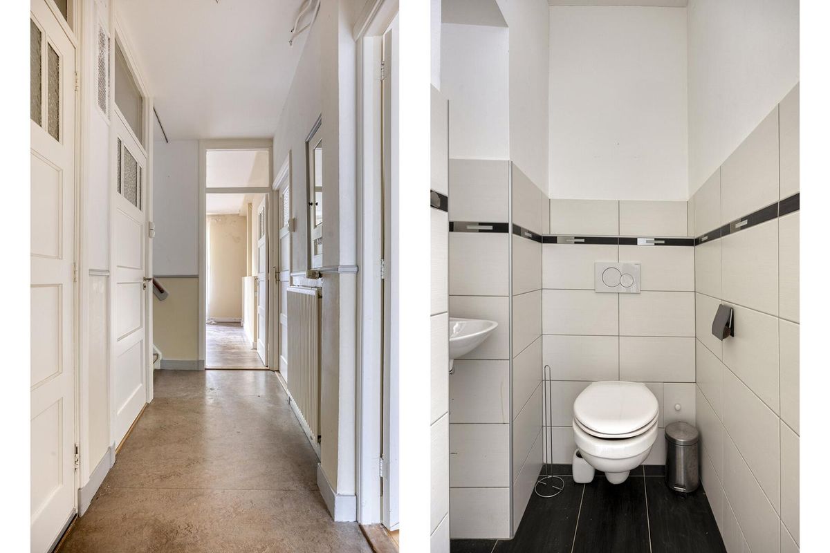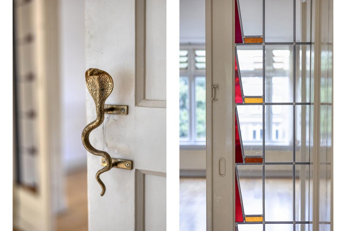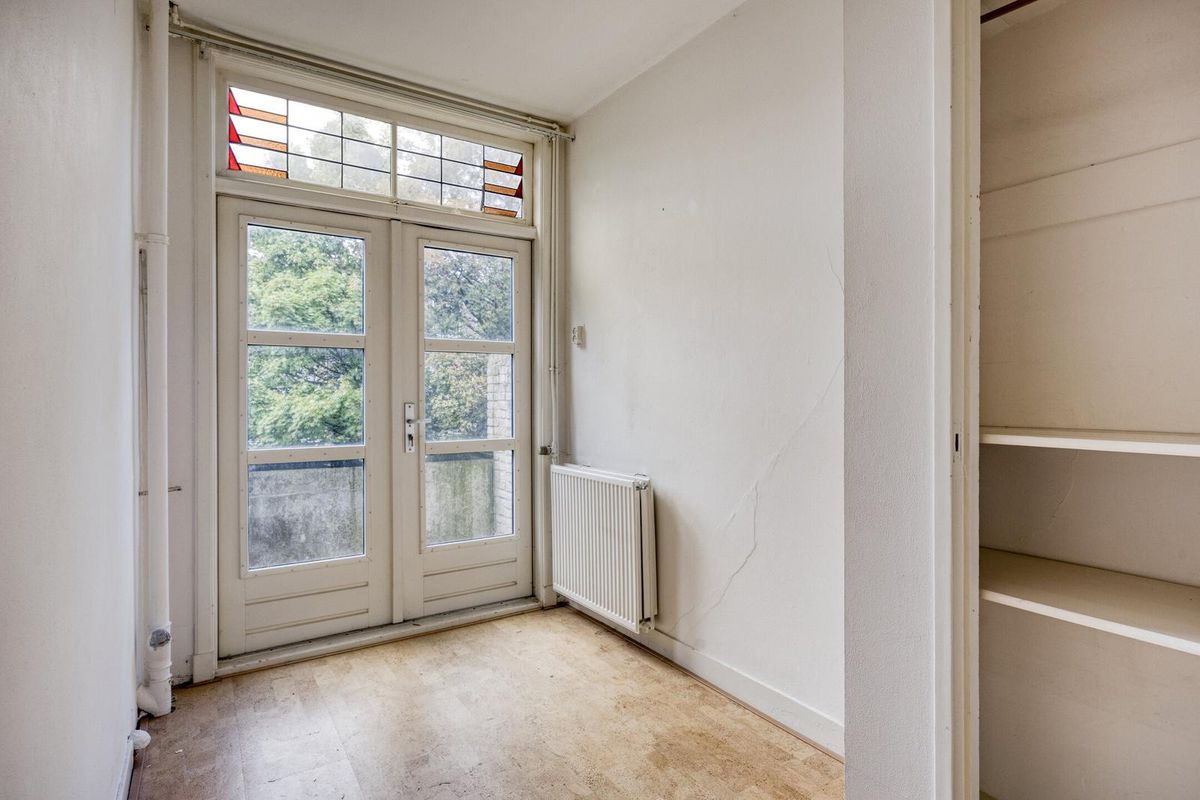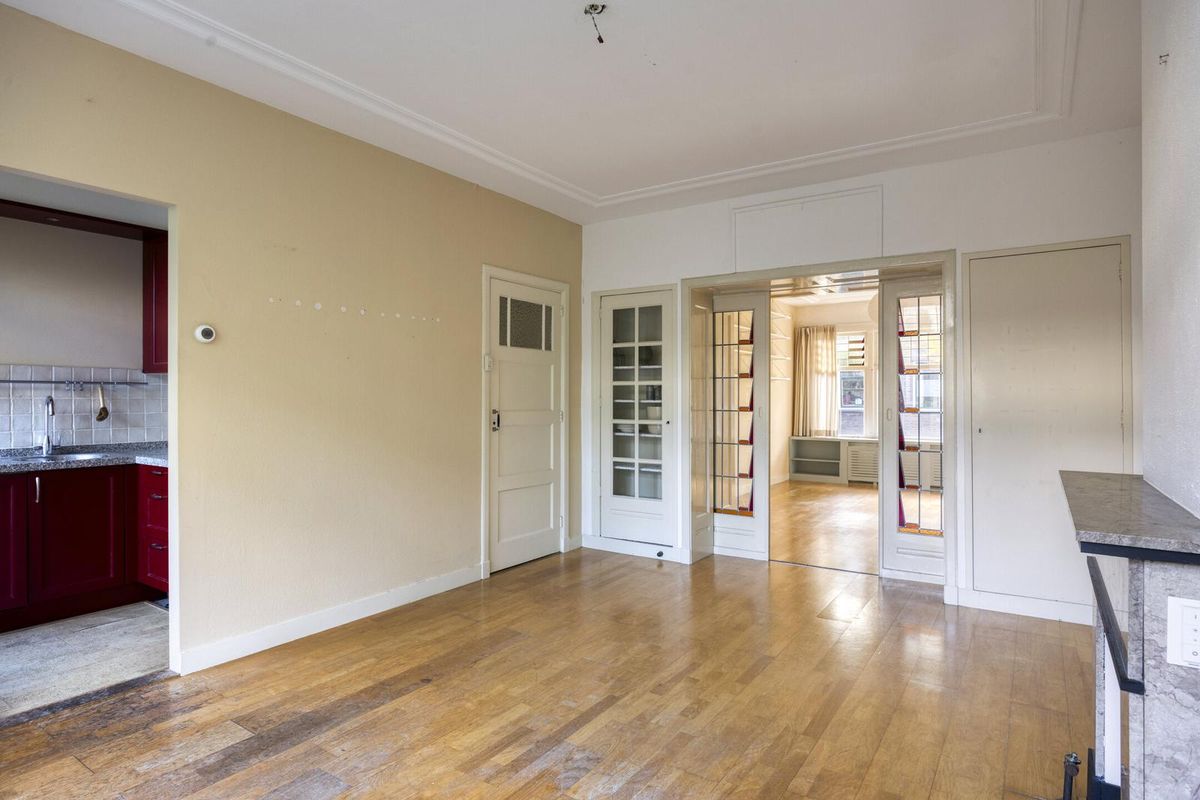 - Gehele woning is voorzien van een parketvloer en authentieke details, zoals glas-in-lood ramen in de schuifdeuren en in de bovenramen;