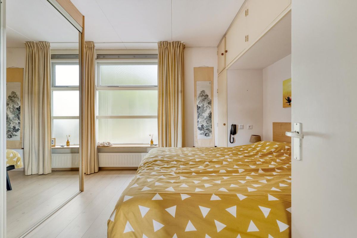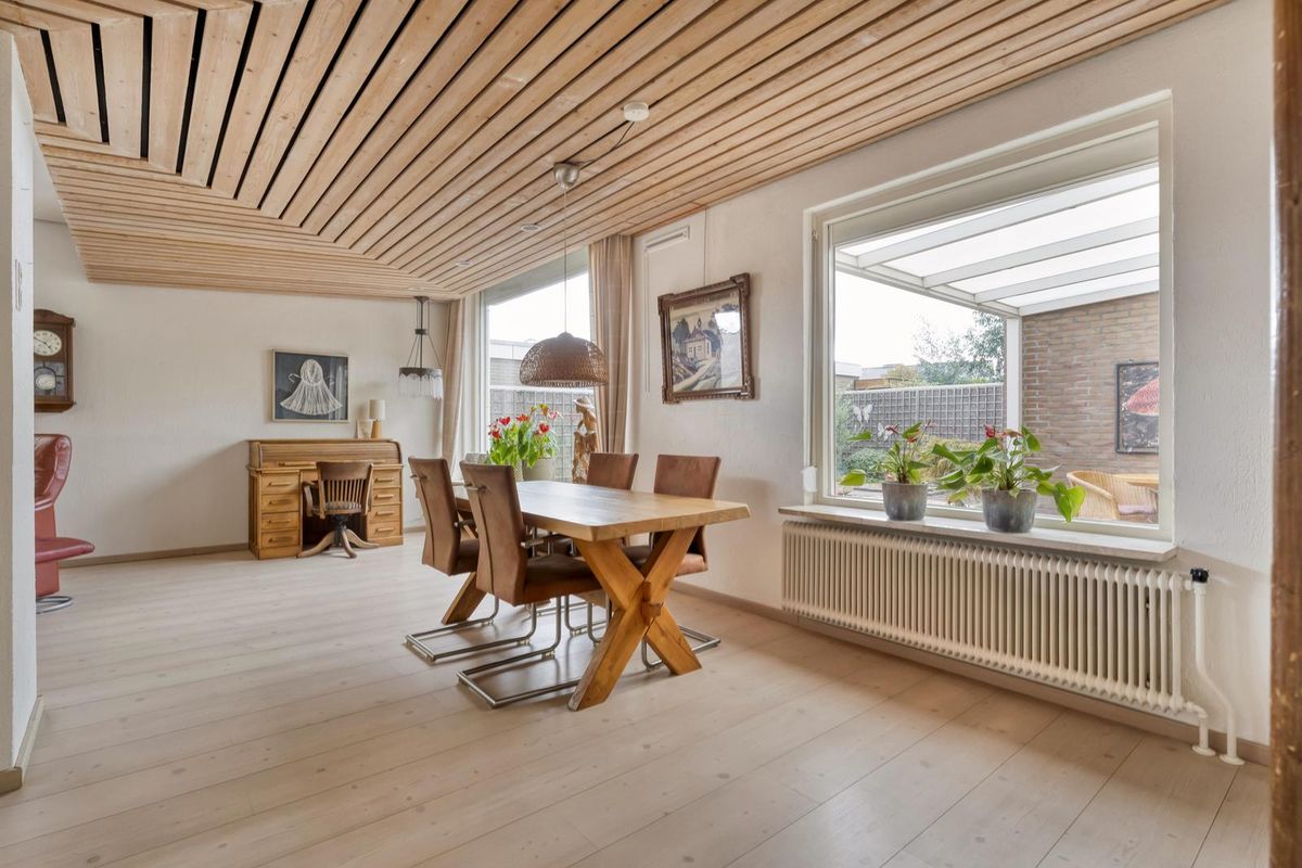 De woonkamer is opvallend licht mede door de grote raampartijen op het zuiden. Vanuit de eethoek is er zicht op de patiotuin. Het plafond is fraai gedetailleerd om de ruimte nog meer sfeer te geven. Er is vanuit het ontwerp heel doordacht met de beleving van binnen naar buiten omgegaan. Vanaf de bank is er een heerlijk uitzicht door de straat!
