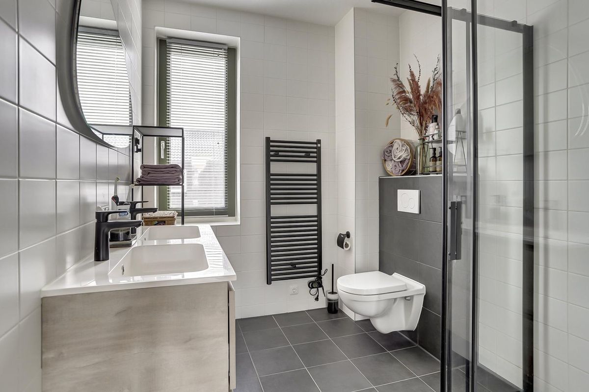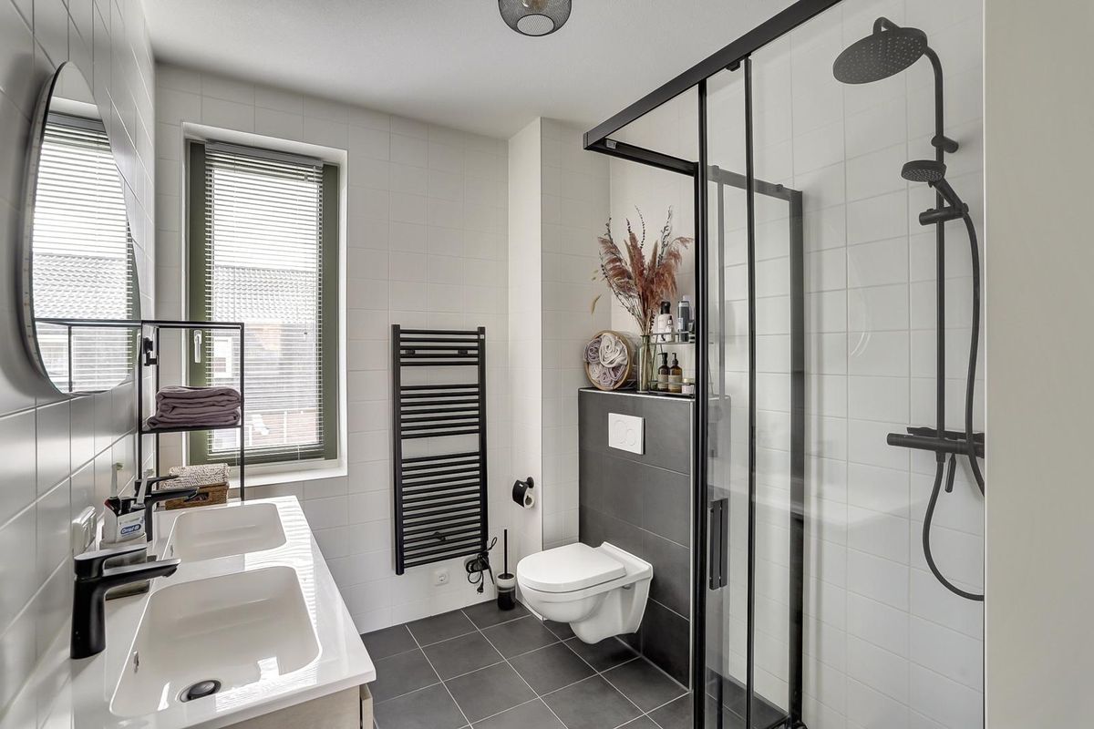 Overloop, drie slaapkamers en een moderne badkamer met inloopdouche, dubbele wastafel en toilet.
