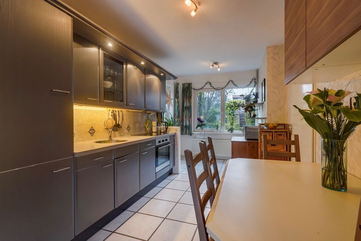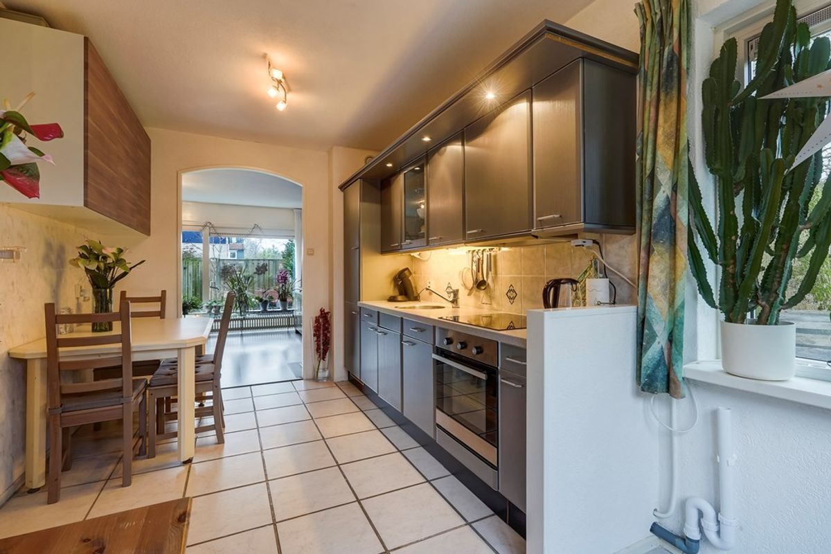 De open keuken bevindt zich aan de straatzijde en is uitgerust met diverse inbouwapparatuur, waaronder een inductiekookplaat, oven, afzuigkap, koelkast en vriezer.