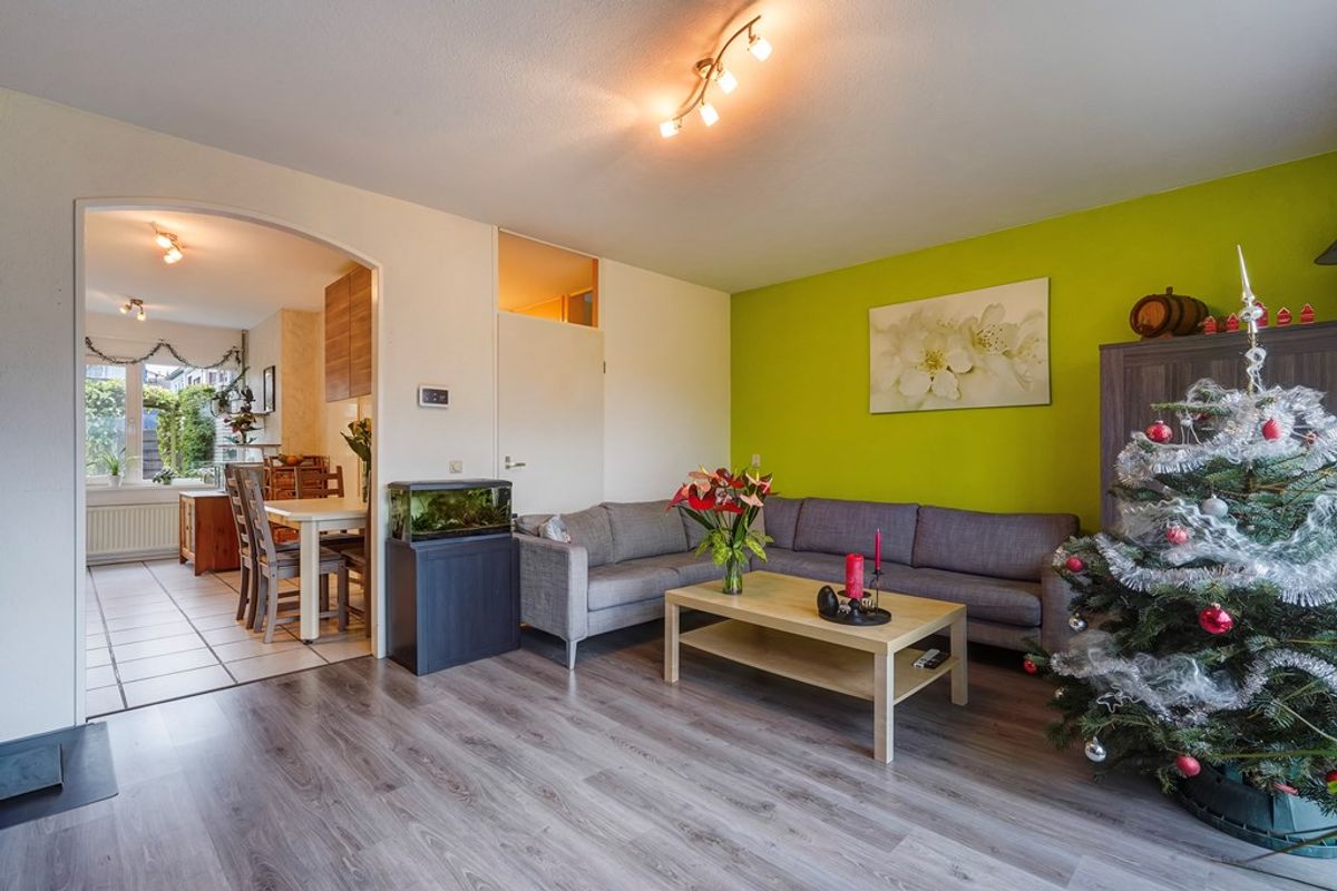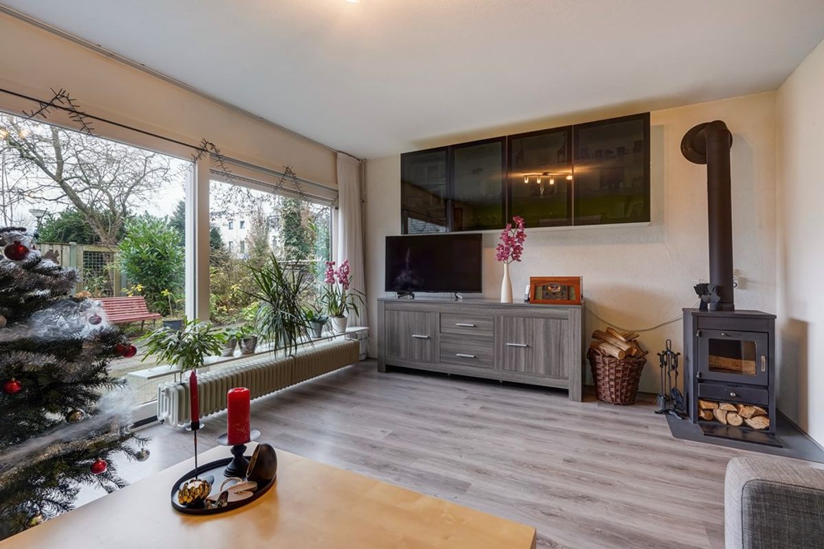 De woonkamer aan de tuinzijde is heerlijk licht, voorzien van een laminaatvloer en een sfeervolle houtkachel, en biedt direct contact met de tuin.