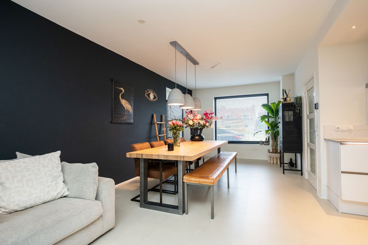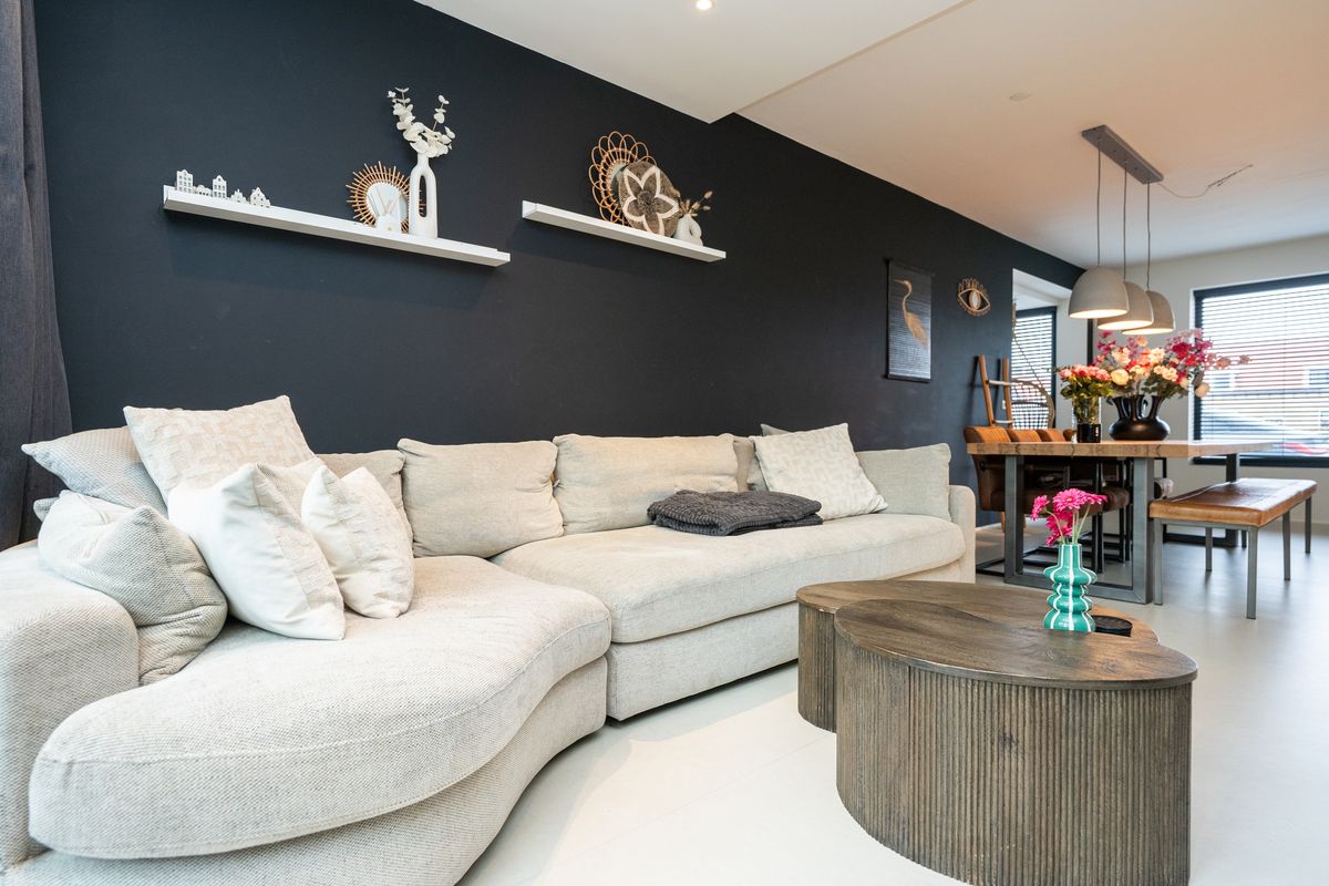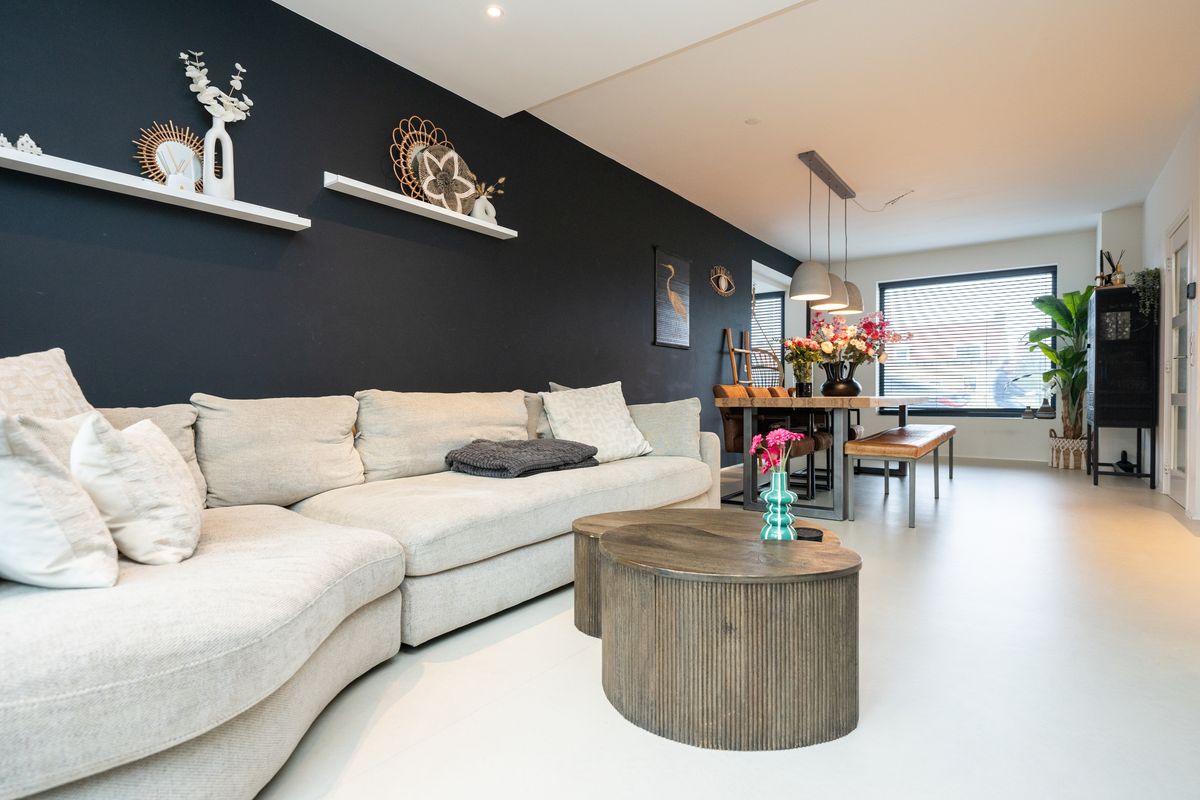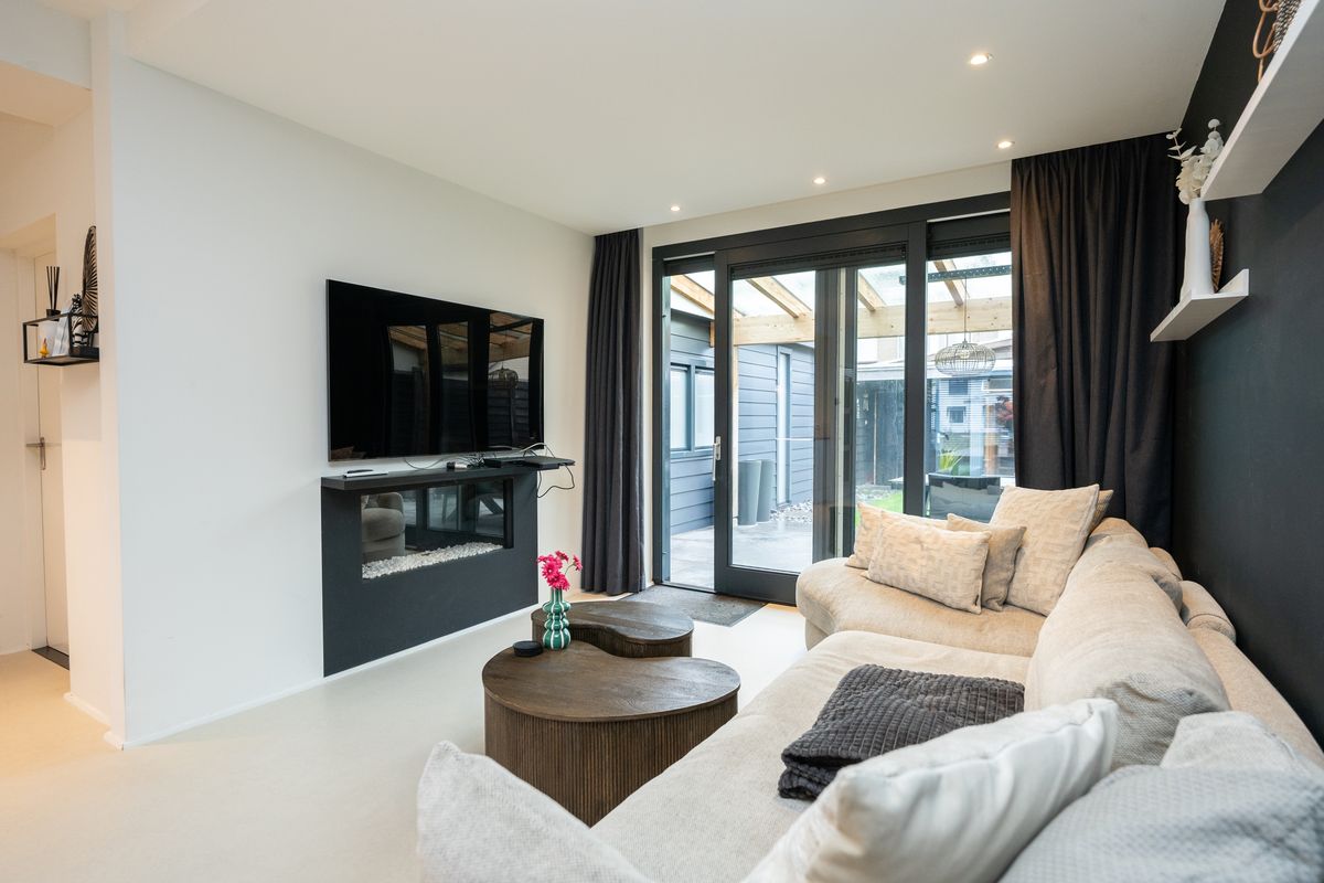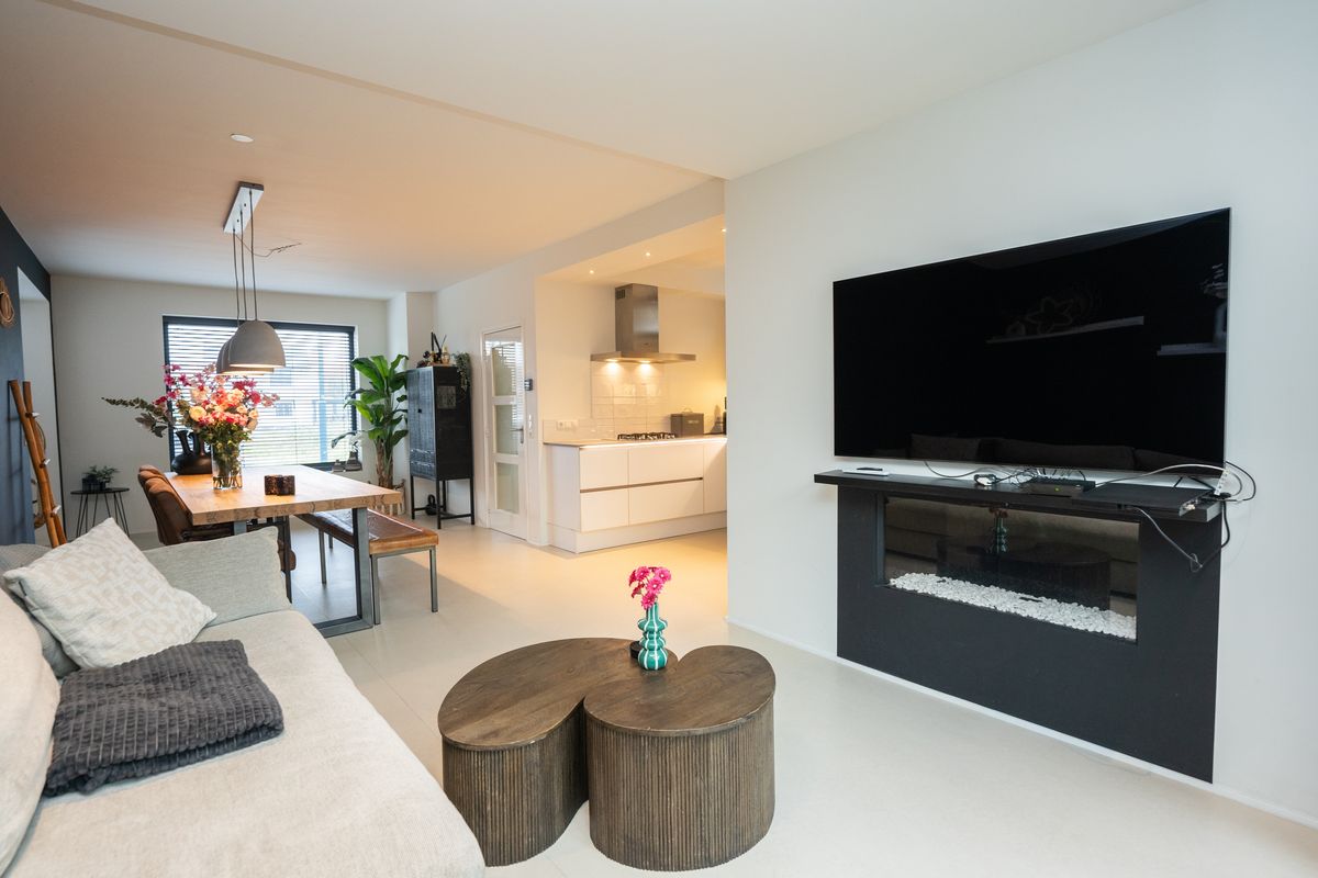 De woonkamer is voorzien van een strakke linoleumvloer, inbouwsfeerhaard en inbouwverlichting, wat zorgt voor een warme, moderne uitstraling. Een prachtig geheel!