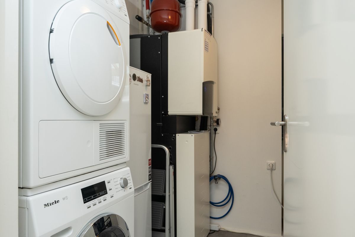 Aansluitend bevindt zich de bijkeuken, met de opstelling voor wasmachine, droger en de HR CV-ketel (2017). In de hal treft u de trapopgang, trapkast, meterkast en het toilet.