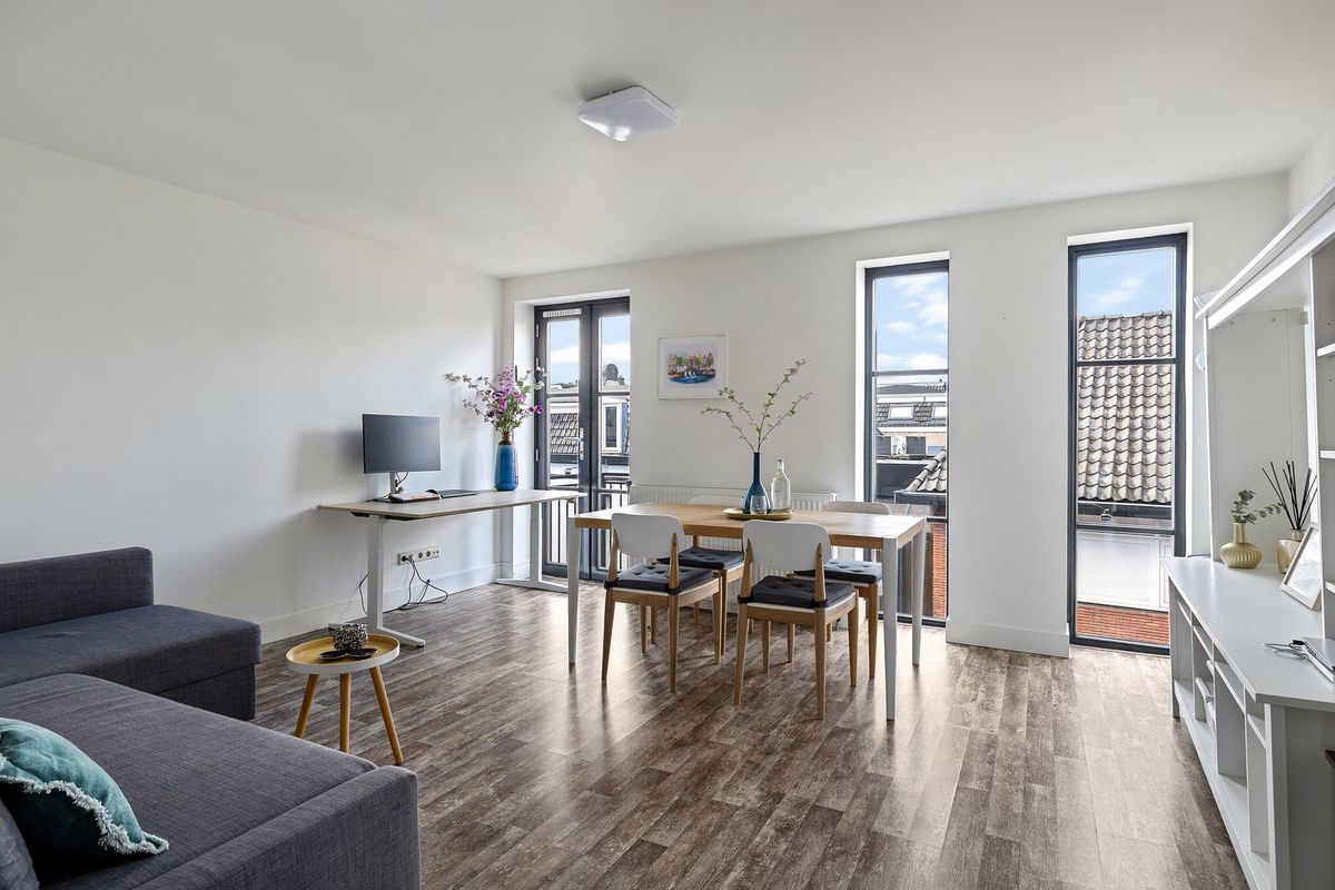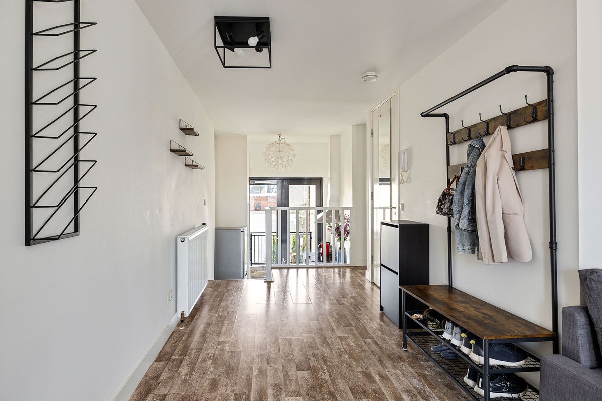 Via de gemeenschappelijke entree op de begane grond bereik je de ruime hal met meterkasten en het trappenhuis naar de tweede verdieping, waar zich de entree van het appartement bevindt. Je komt binnen in een lichte, L-vormige woonkamer met toegang tot het balkon aan de voorzijde (westen).