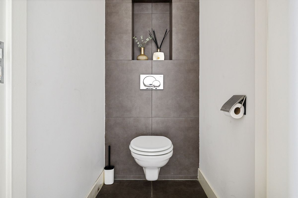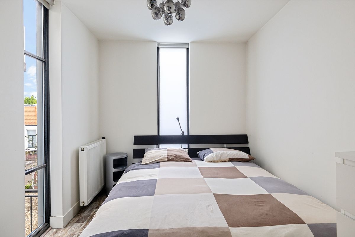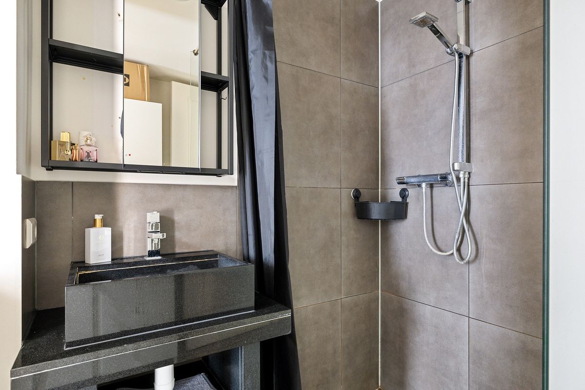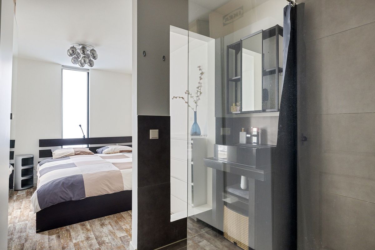 Vanuit de woonkamer is er een doorloop naar een modern toilet en de ruime slaapkamer, die is voorzien van een half open badkamer (met vloerverfwarming) met een inloopdouche en stijlvol wastafelmeubel. De slaapkamer is aan de achterzijde gelegen, weg van de drukke straat, dus heerlijk rustig.