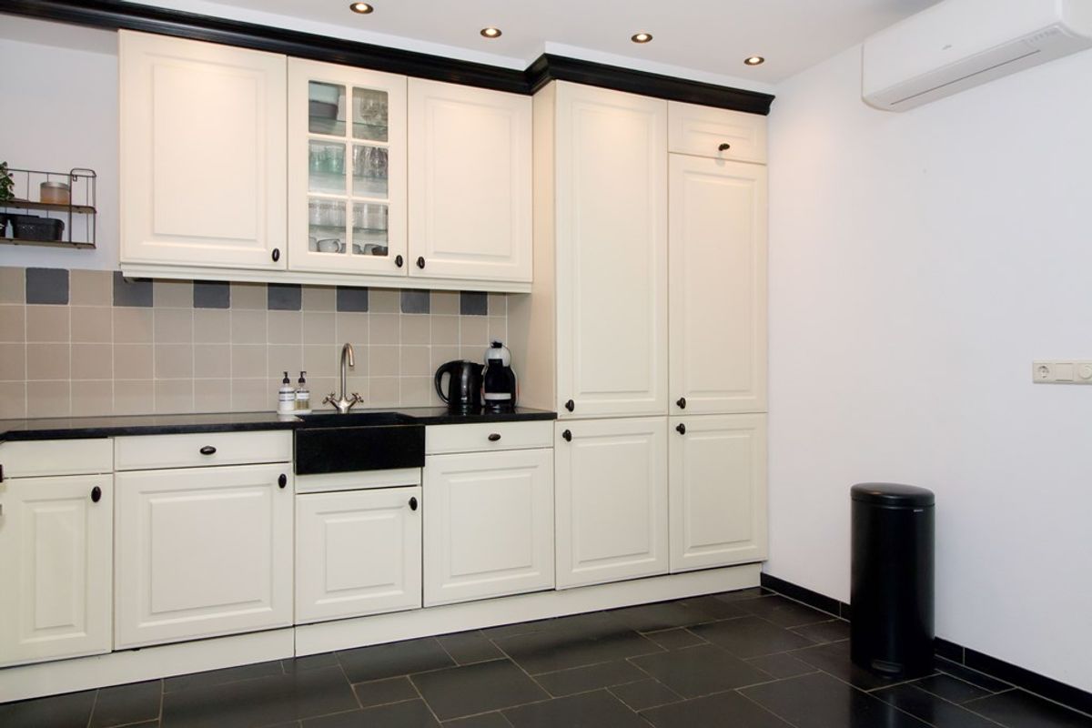 Aan de achterzijde bevindt zich de open keuken, uitgevoerd in een lichte opstelling en voorzien van diverse inbouwapparatuur. De keuken heeft een directe verbinding met de eetkamer, waardoor een gezellige en open leefruimte ontstaat. Ideaal voor het ontvangen van gasten of het gezinsleven.