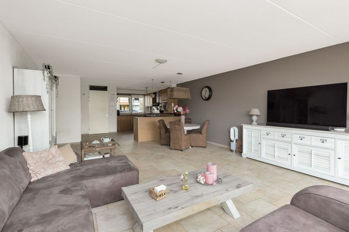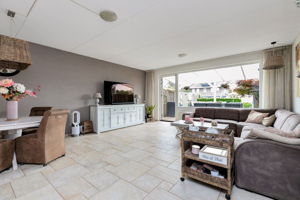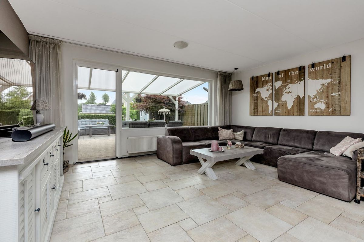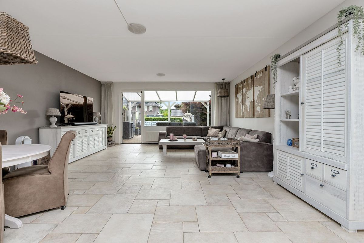 - De tijdens de bouw uitgebouwde woonkamer is aan de achterzijde gelegen en heeft grote raampartijen, toegang tot het vlonderterras met terrasoverkapping en heeft een trapkast.