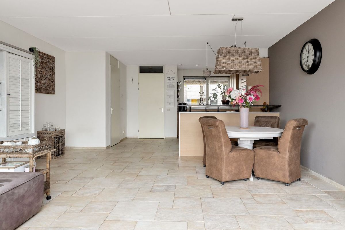 - De woonkamer is voorzien van een plavuizen vloer met vloerverwarming (als bijverwarming).
