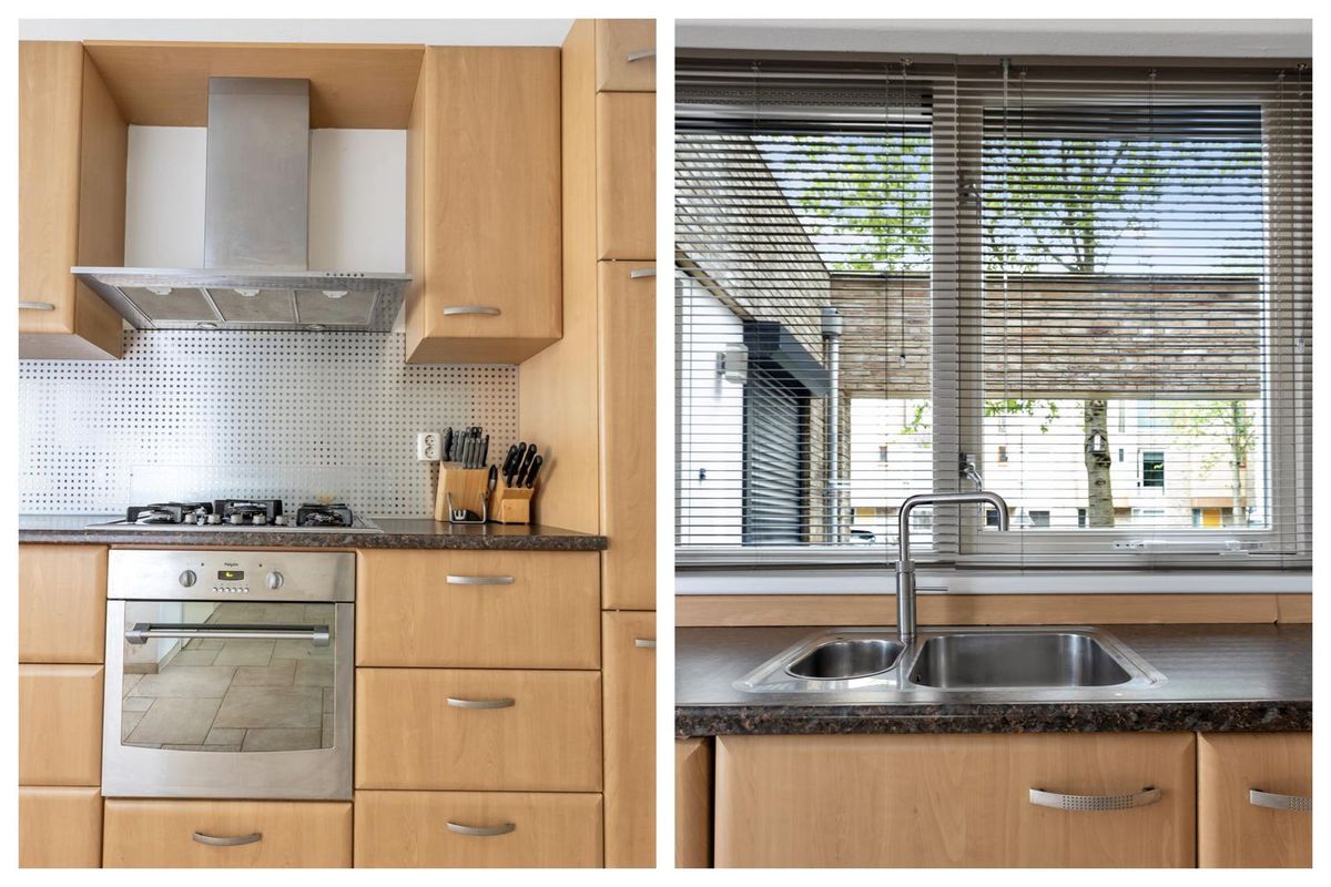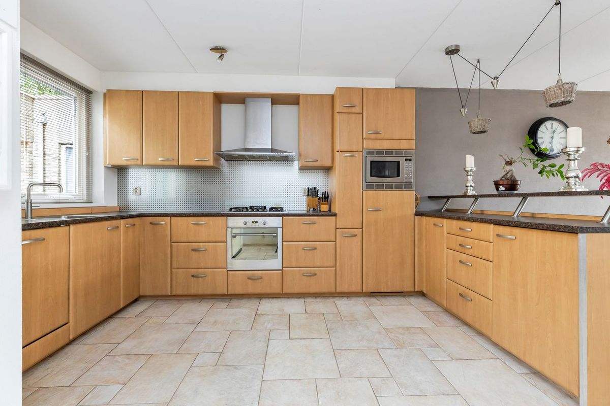 - Aan de voorzijde vindt u de ruim opgestelde, complete keuken met inbouwapparatuur. De keuken is voorzien van een vaatwasser, oven, gas op glas kookplaat, afzuigkap met motor, magnetron, koelkast en een Quooker.