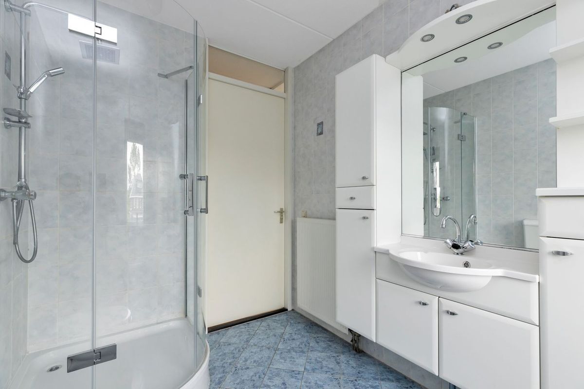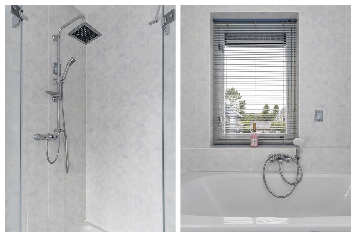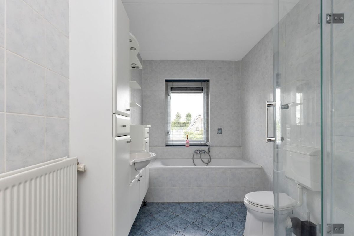 - De badkamer is voorzien van een ligbad, douchecabine, toilet een wastafel in een meubel, een douchecabine en heeft daglicht