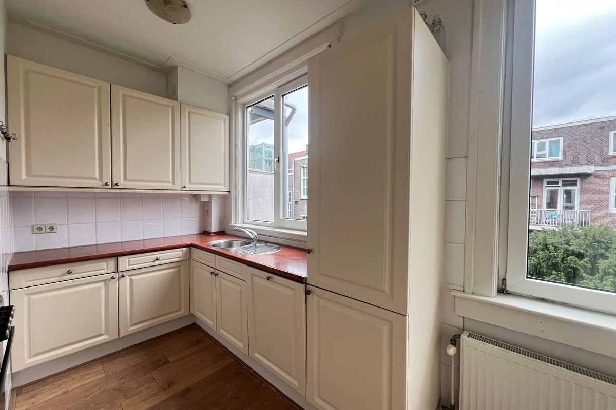 Aan de voorzijde zijn beide slaapkamers. De keuken ligt aan de achterzijde van de woning en is voorzien van een ijskast, gasfornuis en een afwasmachine.