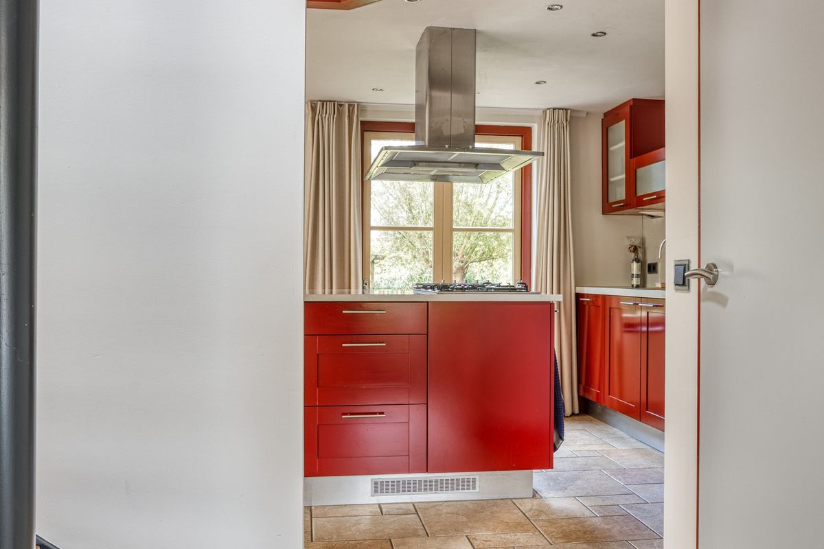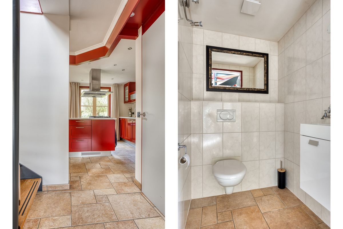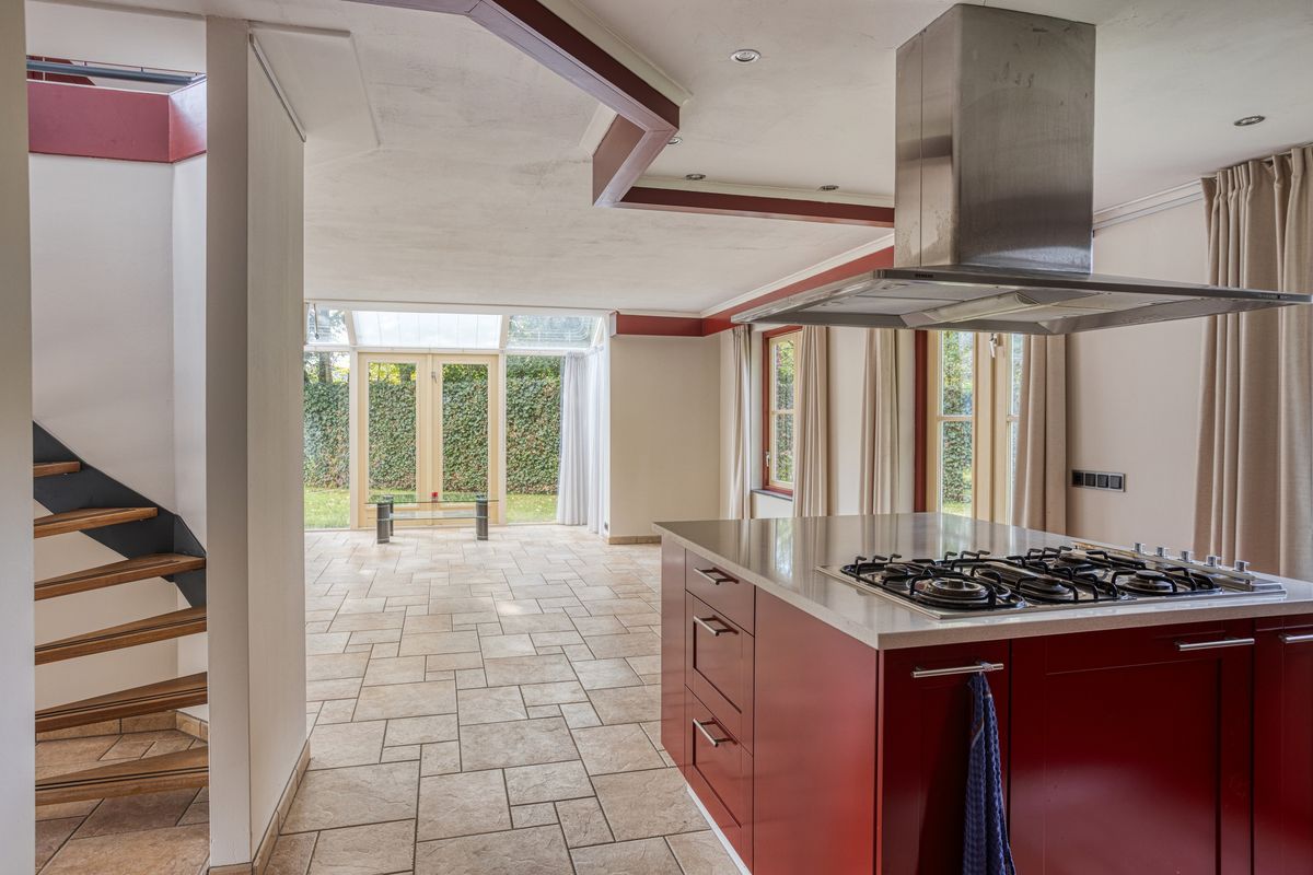 Ruime entree met garderobe, meterkast, trapopgang met vaste wenteltrap. Zeer royale woonkamer met plavuizen met openslaande tuindeuren naar de tuin, aansluiting voor een houtkachel en eetgedeelte met openslaande tuindeuren naar het terras en de achtertuin, open woonkeuken met kookeiland, voorzien van gaskookstel, oven, koelkast, vriezer, vaatwasser en afzuigkap en voldoende ruimte voor eettafel. De gehele begane grond is drempelloos en betegeld. Vanuit de keuken is er toegang tot de bijkeuken met wasmachine aansluiting en genoeg ruimte voor een droger en wasmachine.