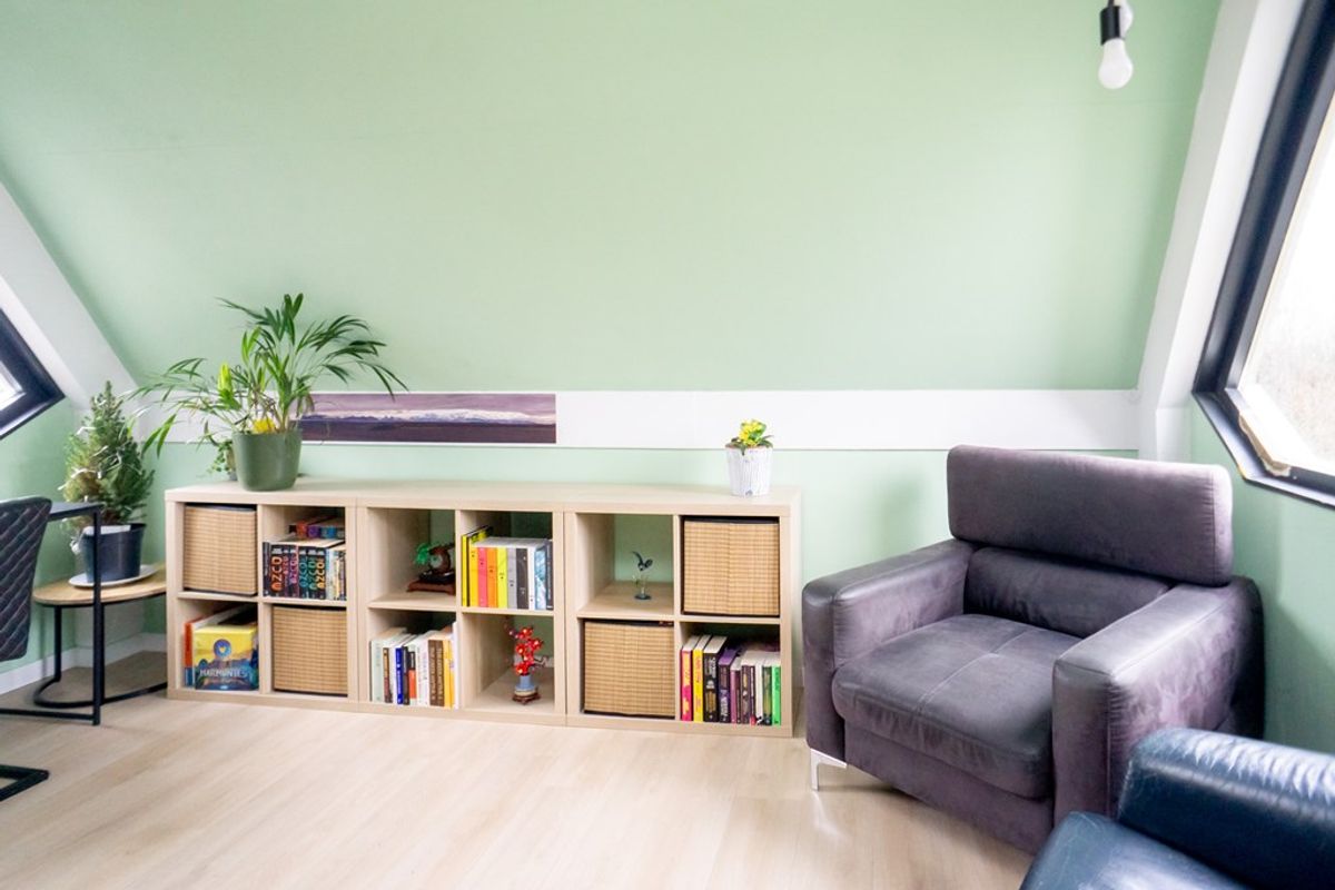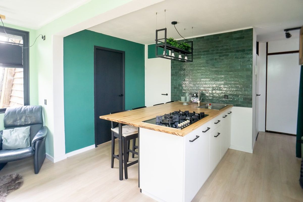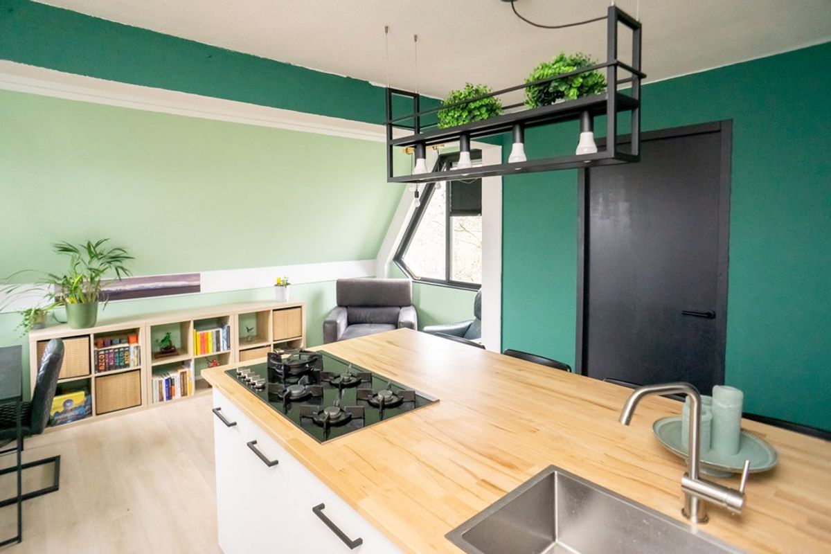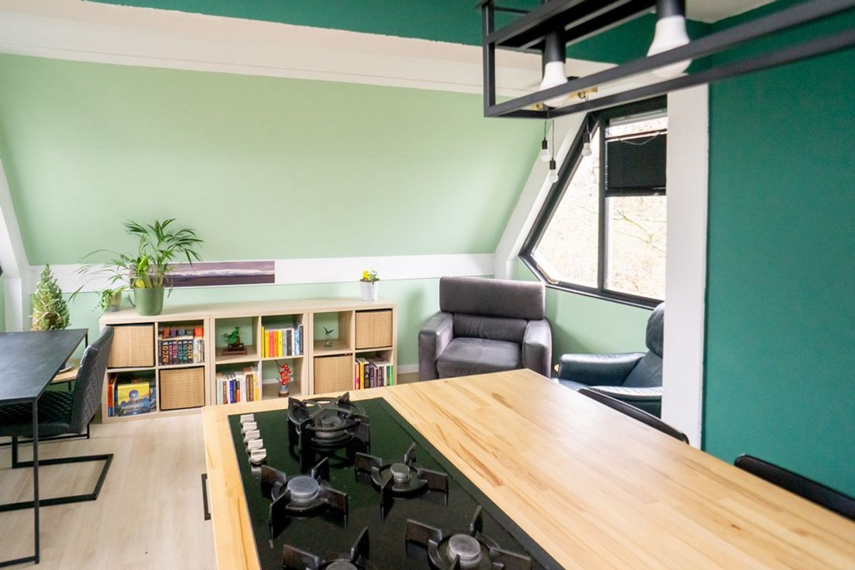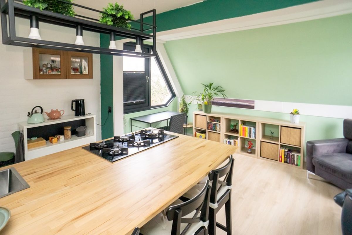 De woonkamer is compact maar sfeervol en wordt gekenmerkt door een prettige lichtinval. In de ruimte bevindt zich een stijlvol kookeiland, dat een centrale plek inneemt en zorgt voor een moderne en open uitstraling. Hierdoor vormt de woonkamer een gezellige plek waar koken, eten en wonen op een natuurlijke manier samenkomen.