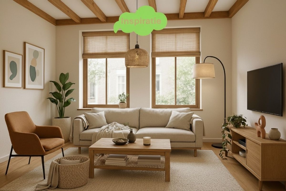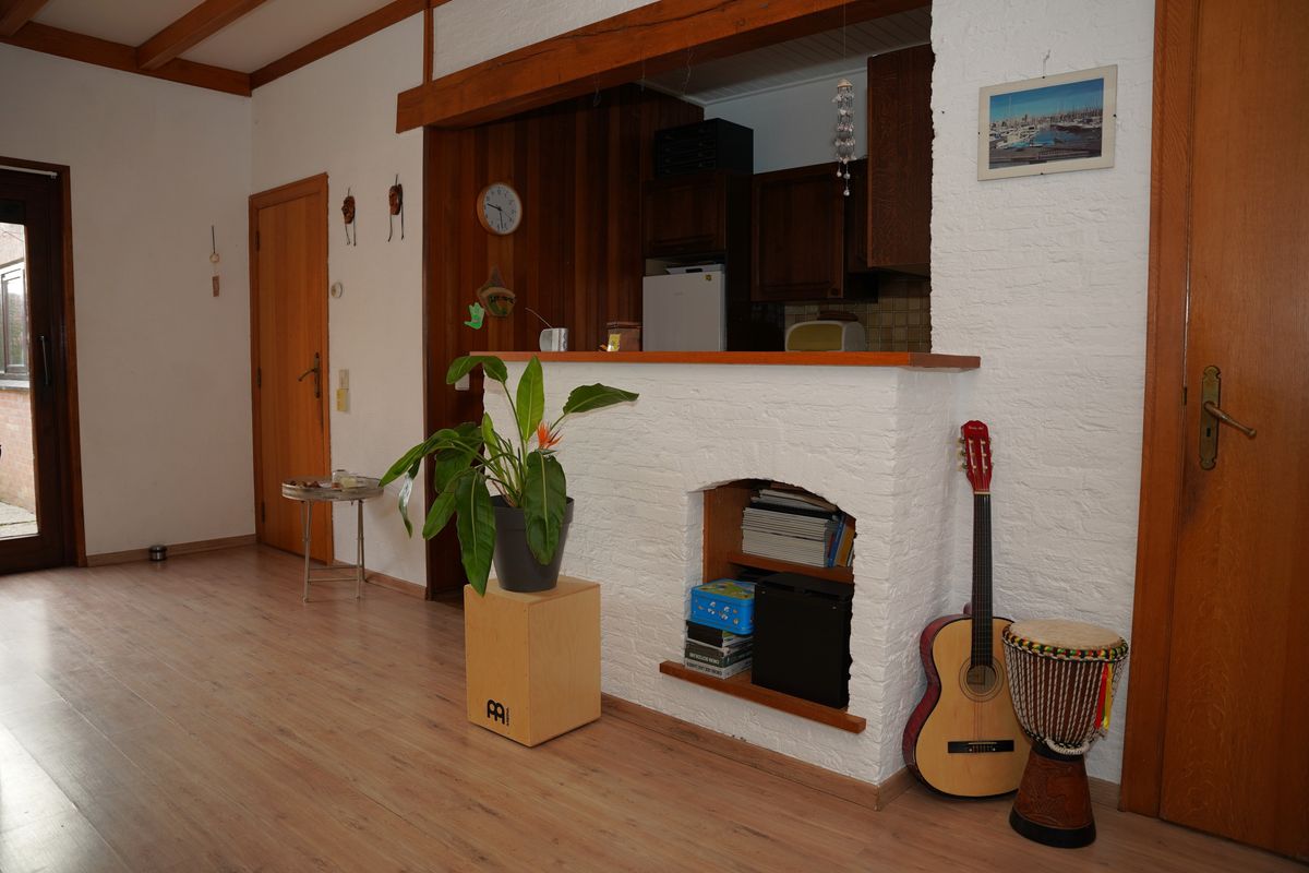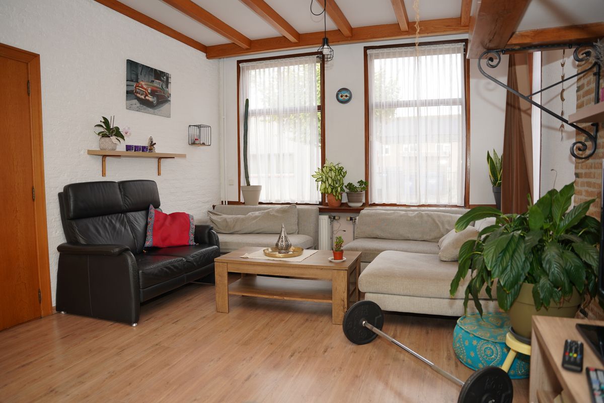 Vanuit de hal kom je in de ruime woonkamer, die verrassend licht en sfeervol is. De grote ramen en de schuifpui naar de tuin zorgen voor een prettige lichtinval en een gevoel van ruimte. De balkenplafonds geven het geheel een warme, huiselijke uitstraling.