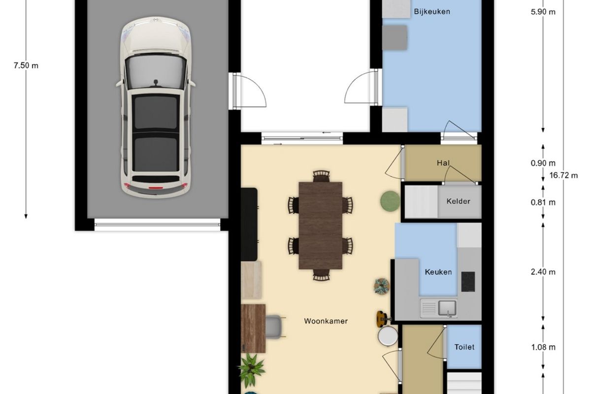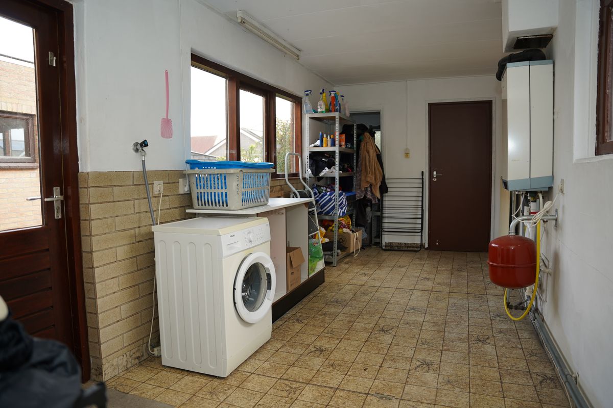 Achter de keuken bevindt zich een achterhal met toegang tot de kelder (droog) en de bijkeuken, waar de aansluiting is voor de wasmachine. Ook bevindt zich hier de CV-installatie en een voormalige sanitaire ruimte die nu in gebruik is als berging.