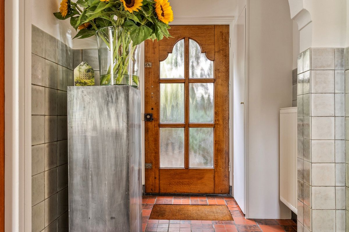 De entree aan de voorzijde van de woning verwelkomt u in een karaktervolle hal met authentieke details. Originele deuren, klassieke vloertegels en deels betegelde wanden met stucwerk erboven zorgen voor een warme en verzorgde uitstraling. Hier bevinden zich de meterkast en het toilet, uitgevoerd met een staand toilet. Vanuit de hal zijn de woonkamer, eetkamer en keuken bereikbaar en leidt de trapopgang naar de eerste verdieping.