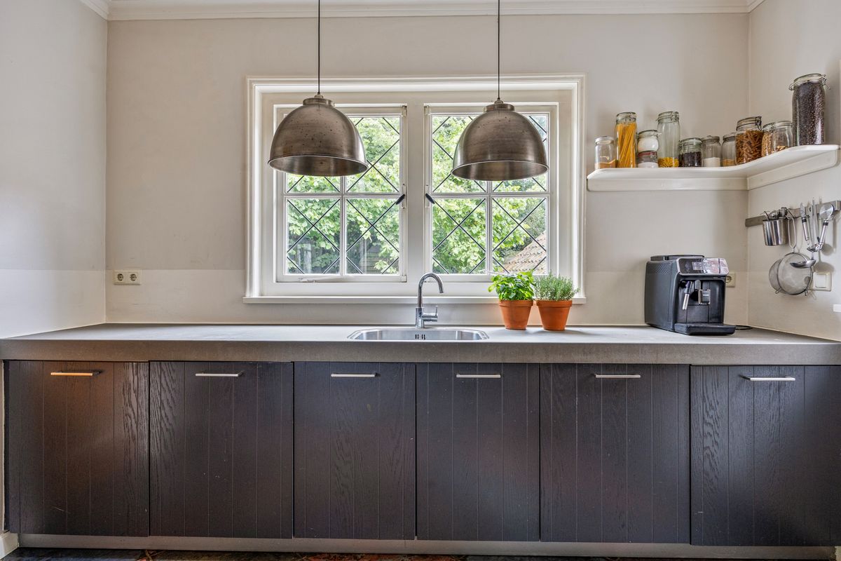 Dankzij de open verbinding met de eet-/zitkamer is dit een ideale plek om samen te koken, te tafelen en te genieten van het dagelijks leven. Een houtkachel voegt extra warmte en sfeer toe, terwijl de originele glas-in-loodramen het geheel een authentieke, bijna nostalgische uitstraling geven.