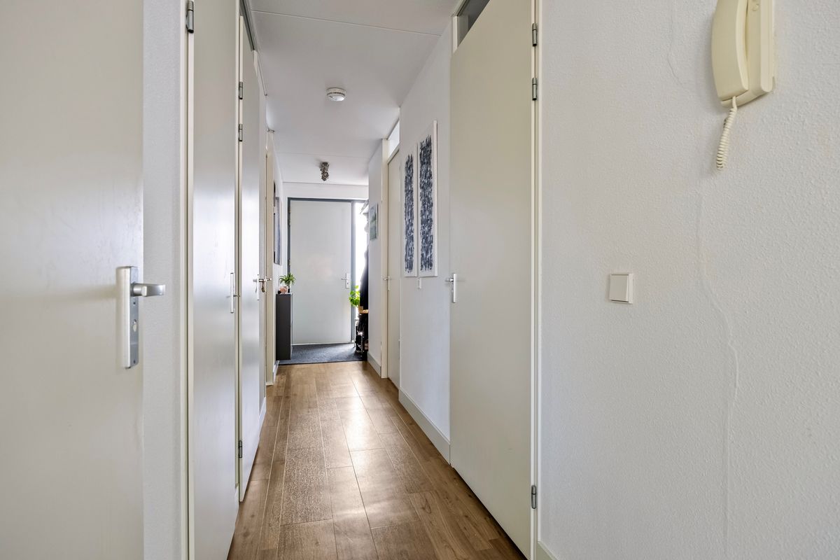 Bij binnenkomst in het appartement betreed je een ruime hal die direct een verzorgde indruk achterlaat. De wanden zijn strak gespoten en de vloer is, net als in de rest van de woning, afgewerkt met een moderne PVC vloer. Vanuit de hal zijn vrijwel alle vertrekken toegankelijk, waaronder de woonkamer, beide slaapkamers, de badkamer, het separate toilet, de technische ruimte en de meterkast. De meterkast is uitgerust met 7 groepen (waarvan 1 dubbele) en twee aardlekschakelaars.