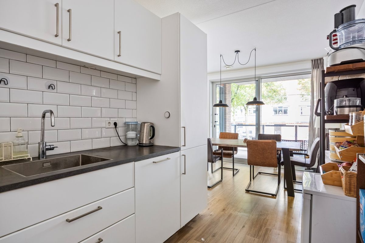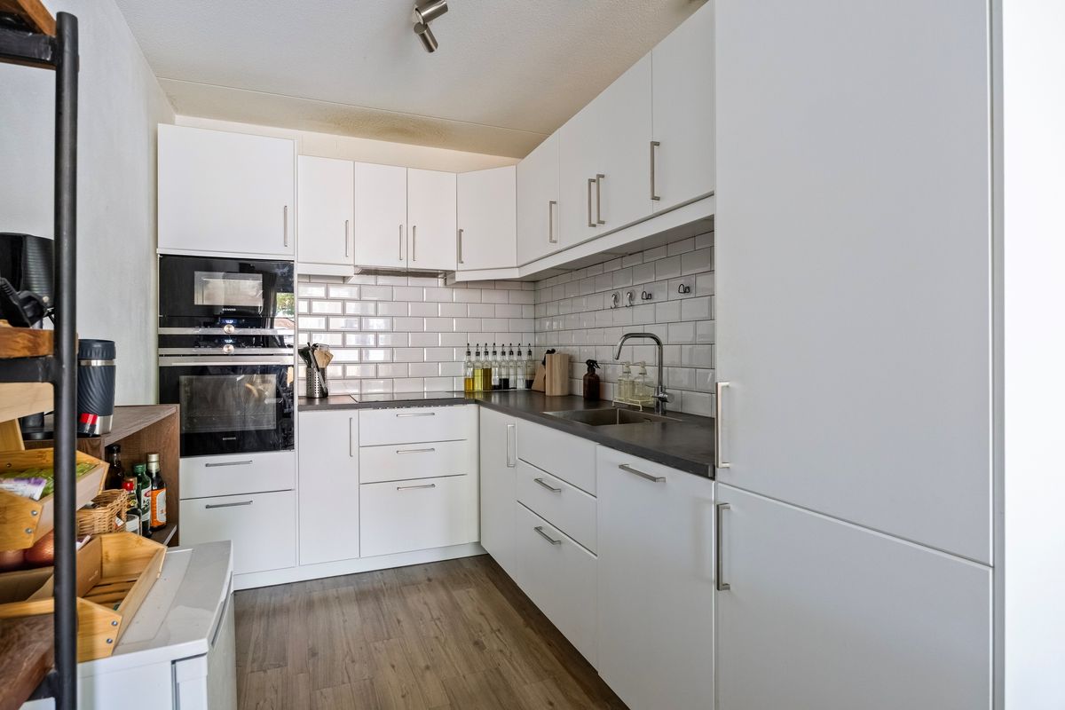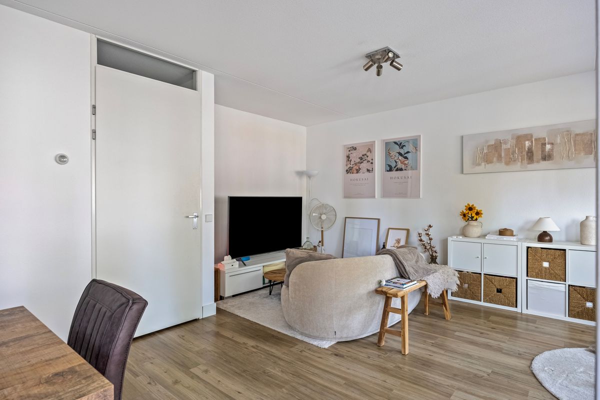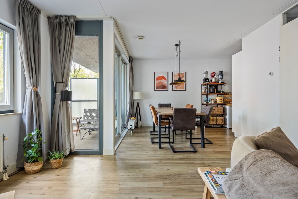De royale woonkamer is het kloppend hart van het appartement. Dankzij de grote raampartijen geniet je hier van een overvloed aan daglicht en een vrij uitzicht op de omgeving. De combinatie van strakke wanden, de warme PVC vloer en de uitstekende lichtinval zorgt voor een comfortabele en sfeervolle leefruimte. Via een brede schuifpui is er directe toegang tot het zonnige balkon, waardoor binnen en buiten mooi in elkaar overlopen.