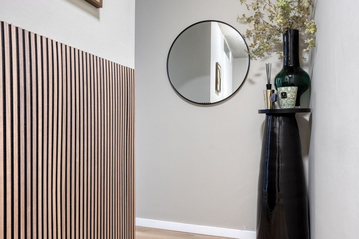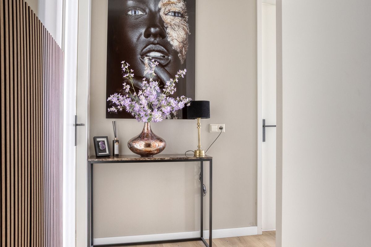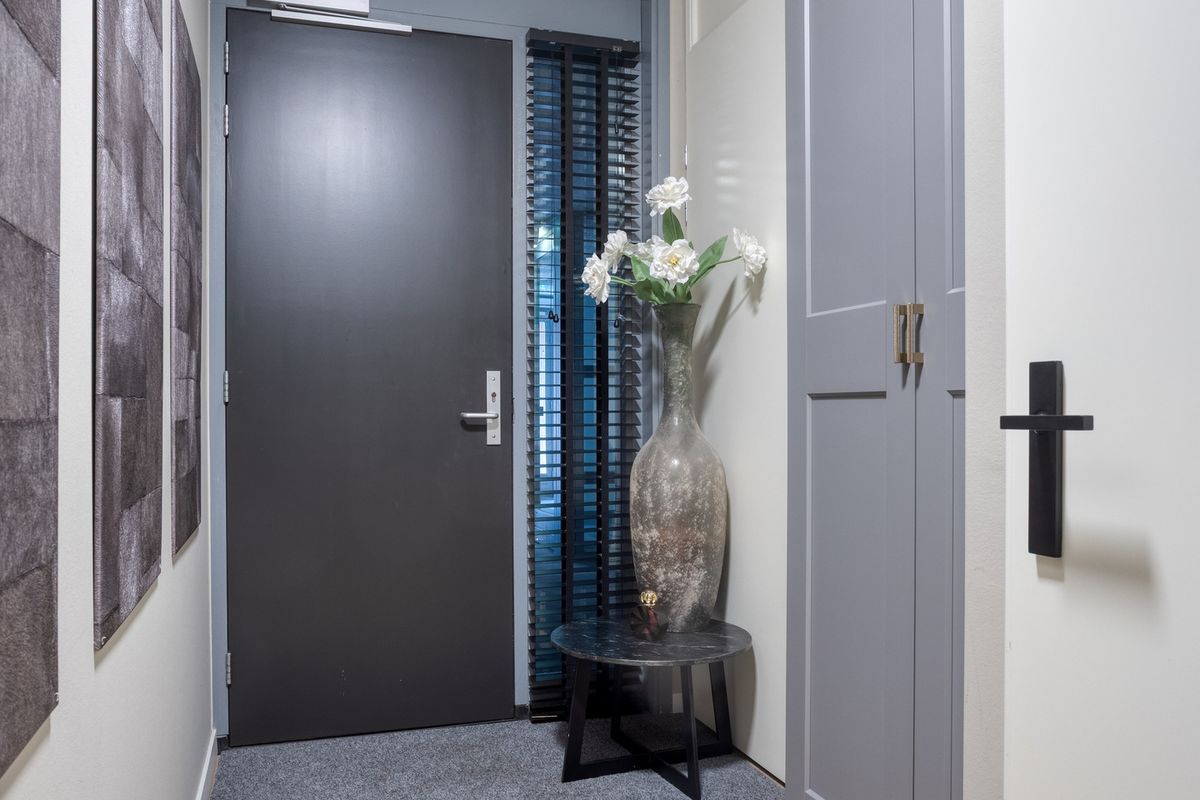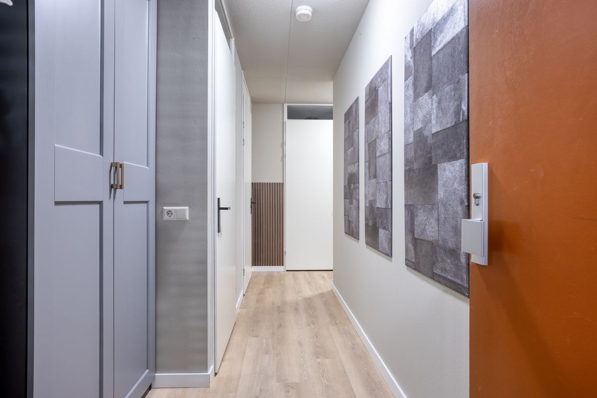 De entree van het pand bevindt zich aan de straatzijde en biedt toegang tot de gezamenlijke hal met brievenbussen en intercom. Vanuit hier bereikt u via de trap of lift het appartement. Zodra u binnenstapt, komt u in de centrale hal van de woning terecht. Deze hal verbindt alle vertrekken met elkaar en biedt voldoende ruimte voor een kapstok of stijlvol opbergmeubel.