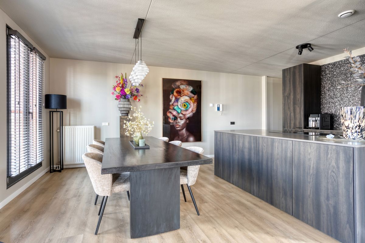 Een ruimtelijke woonkamer vormt het hart van de woning. Dankzij de ronde indeling en de vele raampartijen is de ruimte licht en uitnodigend. U geniet hier van een prachtig uitzicht over de binnenstad van Veenendaal, terwijl de open opzet u de vrijheid geeft om verschillende zithoeken en een ontspanhoek te creëren. Direct grenzend aan de woonkamer bevindt zich een afgesloten leeskamer: een heerlijke plek om in alle rust te ontspannen.