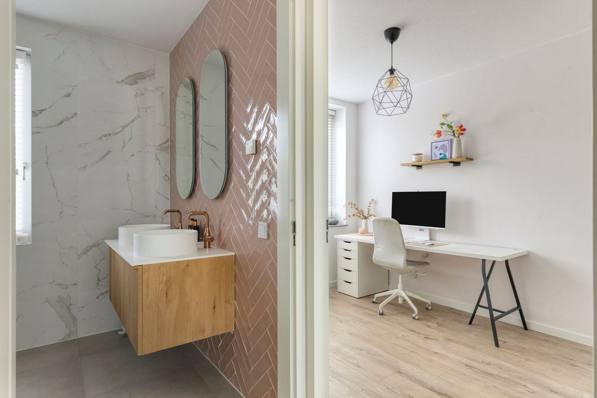 Grenzend aan de overloop bevindt zich de recent (2023) gemoderniseerde badkamer. Deze is voorzien van een inloopdouche, een zwevend toilet en een dubbele wastafel. De eigentijdse afwerking zorgt voor een frisse en luxe uitstraling, waardoor u hier optimaal kunt ontspannen.