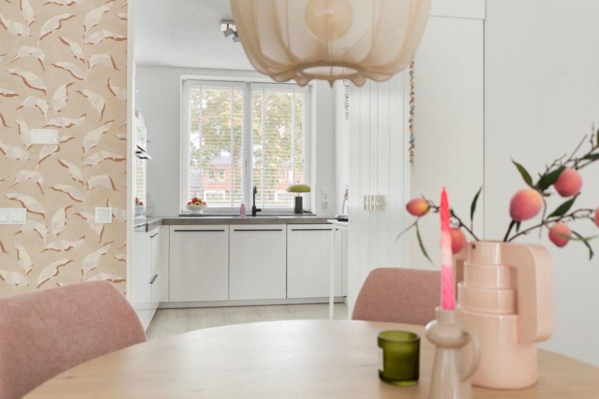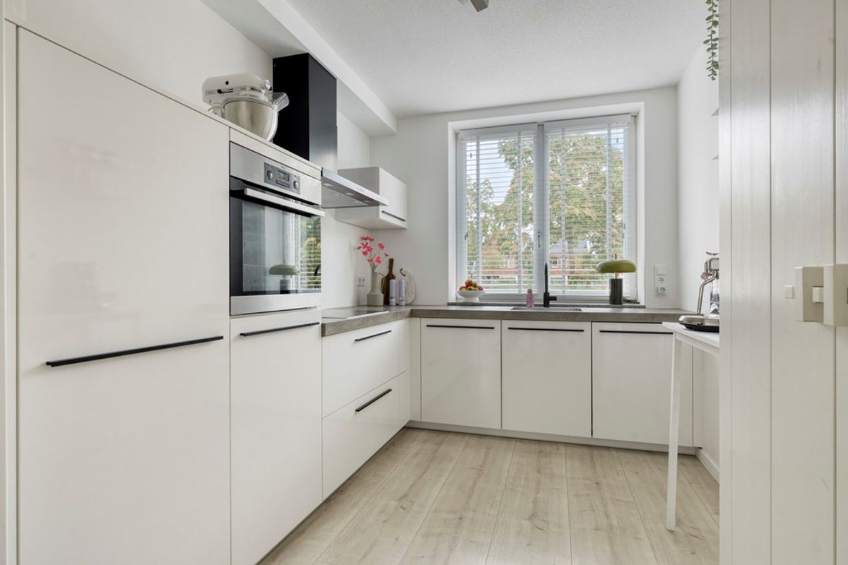 Aan de voorzijde van de woning bevindt zich de keuken, die in open verbinding staat met de woonkamer. De L-vormige keuken is voorzien van diverse inbouwapparatuur, waaronder een keramische kookplaat met afzuigkap, ovencombinatie, vaatwasser, koelkast en een spoelbak met kraan. De keuken verkeert in uitstekende staat en biedt dankzij de lades en kastjes voldoende opbergruimte voor al uw keukengerei.
