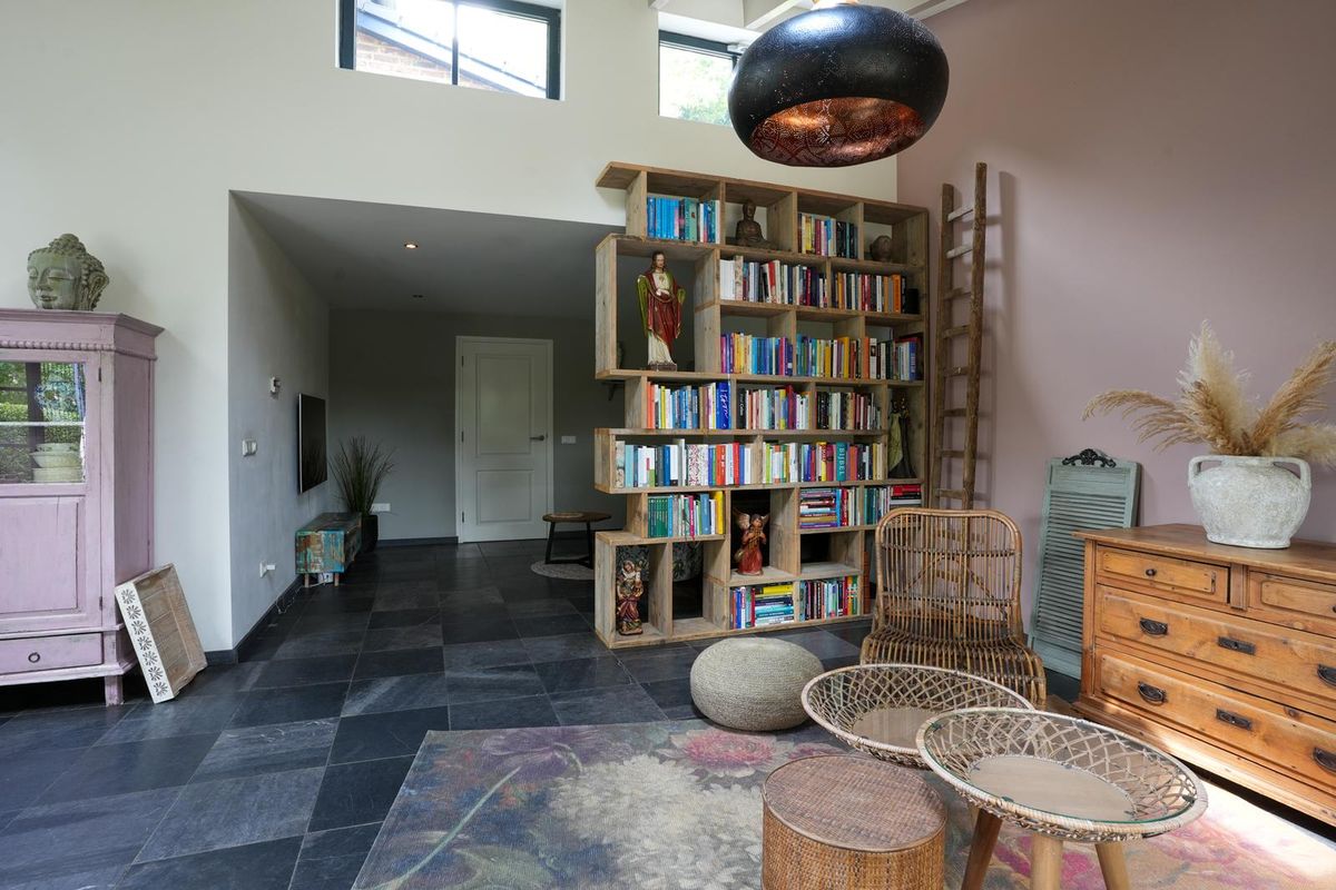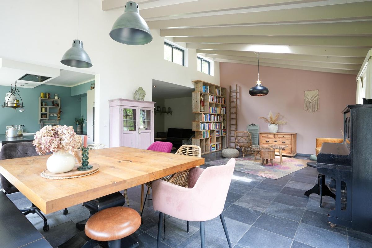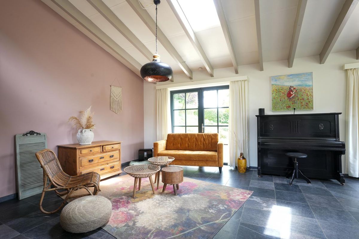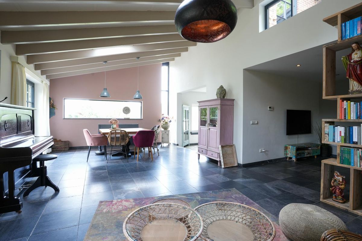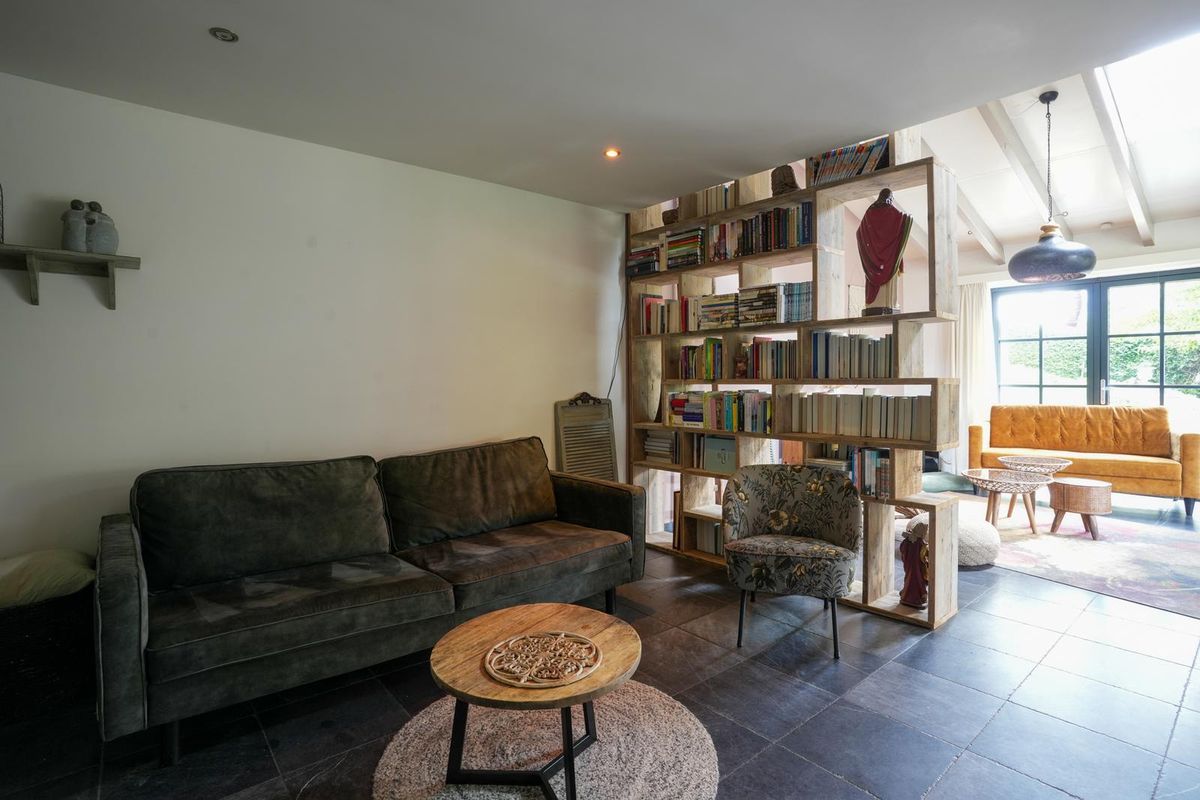 Woonkamer met heldere lichtinval door de diverse raampartijen en dakramen, twee dubbel openslaande tuindeuren naar het terras en de tuin, eetgedeelte, zitgedeelte en televisie hoek. De ruimte is voorzien van een hardstenen vloer.